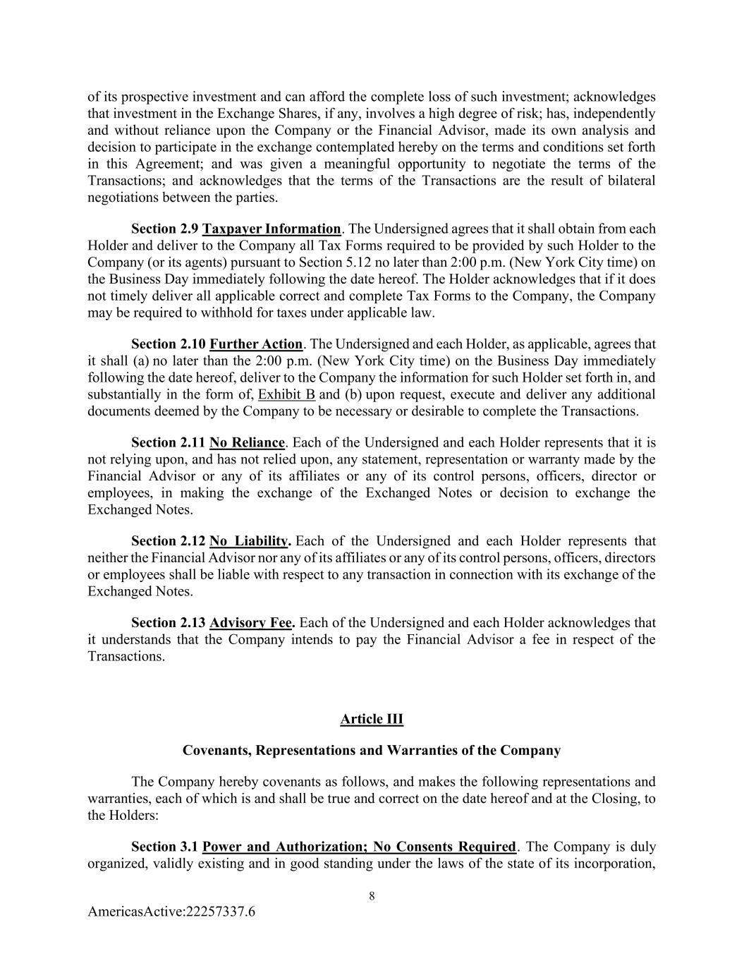 8 AmericasActive:22257337.6 of its prospective investment and can afford the complete loss of such investment; acknowledges that investment in the Exchange Shares, if any, involves a high degree of risk; has, independently and without reliance upon the Company or the Financial Advisor, made its own analysis and decision to participate in the exchange contemplated hereby on the terms and conditions set forth in this Agreement; and was given a meaningful opportunity to negotiate the terms of the Transactions; and acknowledges that the terms of the Transactions are the result of bilateral negotiations between the parties. Section 2.9 Taxpayer Information. The Undersigned agrees that it shall obtain from each Holder and deliver to the Company all Tax Forms required to be provided by such Holder to the Company (or its agents) pursuant to Section 5.12 no later than 2:00 p.m. (New York City time) on the Business Day immediately following the date hereof. The Holder acknowledges that if it does not timely deliver all applicable correct and complete Tax Forms to the Company, the Company may be required to withhold for taxes under applicable law. Section 2.10 Further Action. The Undersigned and each Holder, as applicable, agrees that it shall (a) no later than the 2:00 p.m. (New York City time) on the Business Day immediately following the date hereof, deliver to the Company the information for such Holder set forth in, and substantially in the form of, Exhibit B and (b) upon request, execute and deliver any additional documents deemed by the Company to be necessary or desirable to complete the Transactions. Section 2.11 No Reliance. Each of the Undersigned and each Holder represents that it is not relying upon, and has not relied upon, any statement, representation or warranty made by the Financial Advisor or any of its affiliates or any of its control persons, officers, director or employees, in making the exchange of the Exchanged Notes or decision to exchange the Exchanged Notes. Section 2.12 No Liability. Each of the Undersigned and each Holder represents that neither the Financial Advisor nor any of its affiliates or any of its control persons, officers, directors or employees shall be liable with respect to any transaction in connection with its exchange of the Exchanged Notes. Section 2.13 Advisory Fee. Each of the Undersigned and each Holder acknowledges that it understands that the Company intends to pay the Financial Advisor a fee in respect of the Transactions. Article III Covenants, Representations and Warranties of the Company The Company hereby covenants as follows, and makes the following representations and warranties, each of which is and shall be true and correct on the date hereof and at the Closing, to the Holders: Section 3.1 Power and Authorization; No Consents Required. The Company is duly organized, validly existing and in good standing under the laws of the state of its incorporation,