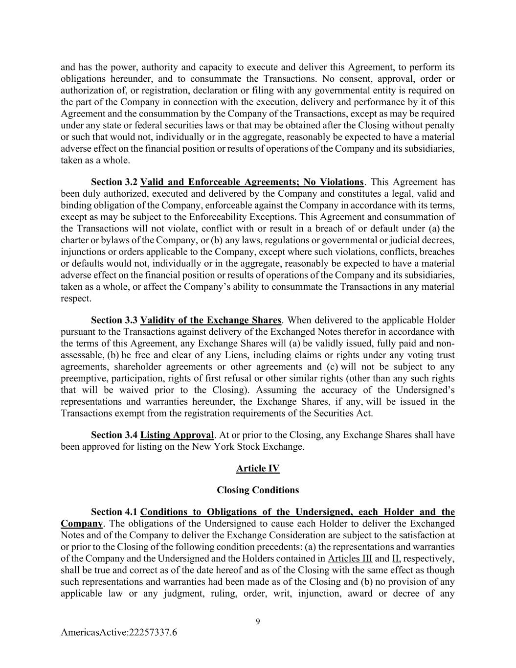 9 AmericasActive:22257337.6 and has the power, authority and capacity to execute and deliver this Agreement, to perform its obligations hereunder, and to consummate the Transactions. No consent, approval, order or authorization of, or registration, declaration or filing with any governmental entity is required on the part of the Company in connection with the execution, delivery and performance by it of this Agreement and the consummation by the Company of the Transactions, except as may be required under any state or federal securities laws or that may be obtained after the Closing without penalty or such that would not, individually or in the aggregate, reasonably be expected to have a material adverse effect on the financial position or results of operations of the Company and its subsidiaries, taken as a whole. Section 3.2 Valid and Enforceable Agreements; No Violations. This Agreement has been duly authorized, executed and delivered by the Company and constitutes a legal, valid and binding obligation of the Company, enforceable against the Company in accordance with its terms, except as may be subject to the Enforceability Exceptions. This Agreement and consummation of the Transactions will not violate, conflict with or result in a breach of or default under (a) the charter or bylaws of the Company, or (b) any laws, regulations or governmental or judicial decrees, injunctions or orders applicable to the Company, except where such violations, conflicts, breaches or defaults would not, individually or in the aggregate, reasonably be expected to have a material adverse effect on the financial position or results of operations of the Company and its subsidiaries, taken as a whole, or affect the Company’s ability to consummate the Transactions in any material respect. Section 3.3 Validity of the Exchange Shares. When delivered to the applicable Holder pursuant to the Transactions against delivery of the Exchanged Notes therefor in accordance with the terms of this Agreement, any Exchange Shares will (a) be validly issued, fully paid and non- assessable, (b) be free and clear of any Liens, including claims or rights under any voting trust agreements, shareholder agreements or other agreements and (c) will not be subject to any preemptive, participation, rights of first refusal or other similar rights (other than any such rights that will be waived prior to the Closing). Assuming the accuracy of the Undersigned’s representations and warranties hereunder, the Exchange Shares, if any, will be issued in the Transactions exempt from the registration requirements of the Securities Act. Section 3.4 Listing Approval. At or prior to the Closing, any Exchange Shares shall have been approved for listing on the New York Stock Exchange. Article IV Closing Conditions Section 4.1 Conditions to Obligations of the Undersigned, each Holder and the Company. The obligations of the Undersigned to cause each Holder to deliver the Exchanged Notes and of the Company to deliver the Exchange Consideration are subject to the satisfaction at or prior to the Closing of the following condition precedents: (a) the representations and warranties of the Company and the Undersigned and the Holders contained in Articles III and II, respectively, shall be true and correct as of the date hereof and as of the Closing with the same effect as though such representations and warranties had been made as of the Closing and (b) no provision of any applicable law or any judgment, ruling, order, writ, injunction, award or decree of any