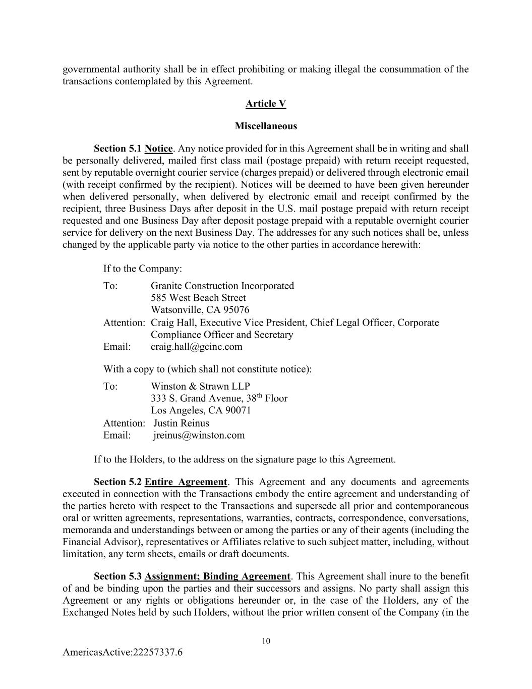 10 AmericasActive:22257337.6 governmental authority shall be in effect prohibiting or making illegal the consummation of the transactions contemplated by this Agreement. Article V Miscellaneous Section 5.1 Notice. Any notice provided for in this Agreement shall be in writing and shall be personally delivered, mailed first class mail (postage prepaid) with return receipt requested, sent by reputable overnight courier service (charges prepaid) or delivered through electronic email (with receipt confirmed by the recipient). Notices will be deemed to have been given hereunder when delivered personally, when delivered by electronic email and receipt confirmed by the recipient, three Business Days after deposit in the U.S. mail postage prepaid with return receipt requested and one Business Day after deposit postage prepaid with a reputable overnight courier service for delivery on the next Business Day. The addresses for any such notices shall be, unless changed by the applicable party via notice to the other parties in accordance herewith: If to the Company: To: Granite Construction Incorporated 585 West Beach Street Watsonville, CA 95076 Attention: Craig Hall, Executive Vice President, Chief Legal Officer, Corporate Compliance Officer and Secretary Email: craig.hall@gcinc.com With a copy to (which shall not constitute notice): To: Winston & Strawn LLP 333 S. Grand Avenue, 38th Floor Los Angeles, CA 90071 Attention: Justin Reinus Email: jreinus@winston.com If to the Holders, to the address on the signature page to this Agreement. Section 5.2 Entire Agreement. This Agreement and any documents and agreements executed in connection with the Transactions embody the entire agreement and understanding of the parties hereto with respect to the Transactions and supersede all prior and contemporaneous oral or written agreements, representations, warranties, contracts, correspondence, conversations, memoranda and understandings between or among the parties or any of their agents (including the Financial Advisor), representatives or Affiliates relative to such subject matter, including, without limitation, any term sheets, emails or draft documents. Section 5.3 Assignment; Binding Agreement. This Agreement shall inure to the benefit of and be binding upon the parties and their successors and assigns. No party shall assign this Agreement or any rights or obligations hereunder or, in the case of the Holders, any of the Exchanged Notes held by such Holders, without the prior written consent of the Company (in the