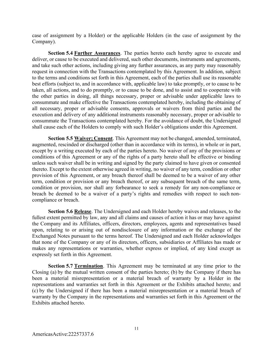11 AmericasActive:22257337.6 case of assignment by a Holder) or the applicable Holders (in the case of assignment by the Company). Section 5.4 Further Assurances. The parties hereto each hereby agree to execute and deliver, or cause to be executed and delivered, such other documents, instruments and agreements, and take such other actions, including giving any further assurances, as any party may reasonably request in connection with the Transactions contemplated by this Agreement. In addition, subject to the terms and conditions set forth in this Agreement, each of the parties shall use its reasonable best efforts (subject to, and in accordance with, applicable law) to take promptly, or to cause to be taken, all actions, and to do promptly, or to cause to be done, and to assist and to cooperate with the other parties in doing, all things necessary, proper or advisable under applicable laws to consummate and make effective the Transactions contemplated hereby, including the obtaining of all necessary, proper or advisable consents, approvals or waivers from third parties and the execution and delivery of any additional instruments reasonably necessary, proper or advisable to consummate the Transactions contemplated hereby. For the avoidance of doubt, the Undersigned shall cause each of the Holders to comply with such Holder’s obligations under this Agreement. Section 5.5 Waiver; Consent. This Agreement may not be changed, amended, terminated, augmented, rescinded or discharged (other than in accordance with its terms), in whole or in part, except by a writing executed by each of the parties hereto. No waiver of any of the provisions or conditions of this Agreement or any of the rights of a party hereto shall be effective or binding unless such waiver shall be in writing and signed by the party claimed to have given or consented thereto. Except to the extent otherwise agreed in writing, no waiver of any term, condition or other provision of this Agreement, or any breach thereof shall be deemed to be a waiver of any other term, condition or provision or any breach thereof, or any subsequent breach of the same term, condition or provision, nor shall any forbearance to seek a remedy for any non-compliance or breach be deemed to be a waiver of a party’s rights and remedies with respect to such non- compliance or breach. Section 5.6 Release. The Undersigned and each Holder hereby waives and releases, to the fullest extent permitted by law, any and all claims and causes of action it has or may have against the Company and its Affiliates, officers, directors, employees, agents and representatives based upon, relating to or arising out of nondisclosure of any information or the exchange of the Exchanged Notes pursuant to the terms hereof. The Undersigned and each Holder acknowledges that none of the Company or any of its directors, officers, subsidiaries or Affiliates has made or makes any representations or warranties, whether express or implied, of any kind except as expressly set forth in this Agreement. Section 5.7 Termination. This Agreement may be terminated at any time prior to the Closing (a) by the mutual written consent of the parties hereto; (b) by the Company if there has been a material misrepresentation or a material breach of warranty by a Holder in the representations and warranties set forth in this Agreement or the Exhibits attached hereto; and (c) by the Undersigned if there has been a material misrepresentation or a material breach of warranty by the Company in the representations and warranties set forth in this Agreement or the Exhibits attached hereto.