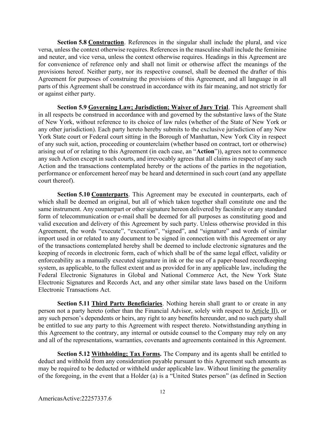 12 AmericasActive:22257337.6 Section 5.8 Construction. References in the singular shall include the plural, and vice versa, unless the context otherwise requires. References in the masculine shall include the feminine and neuter, and vice versa, unless the context otherwise requires. Headings in this Agreement are for convenience of reference only and shall not limit or otherwise affect the meanings of the provisions hereof. Neither party, nor its respective counsel, shall be deemed the drafter of this Agreement for purposes of construing the provisions of this Agreement, and all language in all parts of this Agreement shall be construed in accordance with its fair meaning, and not strictly for or against either party. Section 5.9 Governing Law; Jurisdiction; Waiver of Jury Trial. This Agreement shall in all respects be construed in accordance with and governed by the substantive laws of the State of New York, without reference to its choice of law rules (whether of the State of New York or any other jurisdiction). Each party hereto hereby submits to the exclusive jurisdiction of any New York State court or Federal court sitting in the Borough of Manhattan, New York City in respect of any such suit, action, proceeding or counterclaim (whether based on contract, tort or otherwise) arising out of or relating to this Agreement (in each case, an “Action”)), agrees not to commence any such Action except in such courts, and irrevocably agrees that all claims in respect of any such Action and the transactions contemplated hereby or the actions of the parties in the negotiation, performance or enforcement hereof may be heard and determined in such court (and any appellate court thereof). Section 5.10 Counterparts. This Agreement may be executed in counterparts, each of which shall be deemed an original, but all of which taken together shall constitute one and the same instrument. Any counterpart or other signature hereon delivered by facsimile or any standard form of telecommunication or e-mail shall be deemed for all purposes as constituting good and valid execution and delivery of this Agreement by such party. Unless otherwise provided in this Agreement, the words “execute”, “execution”, “signed”, and “signature” and words of similar import used in or related to any document to be signed in connection with this Agreement or any of the transactions contemplated hereby shall be deemed to include electronic signatures and the keeping of records in electronic form, each of which shall be of the same legal effect, validity or enforceability as a manually executed signature in ink or the use of a paper-based recordkeeping system, as applicable, to the fullest extent and as provided for in any applicable law, including the Federal Electronic Signatures in Global and National Commerce Act, the New York State Electronic Signatures and Records Act, and any other similar state laws based on the Uniform Electronic Transactions Act. Section 5.11 Third Party Beneficiaries. Nothing herein shall grant to or create in any person not a party hereto (other than the Financial Advisor, solely with respect to Article II), or any such person’s dependents or heirs, any right to any benefits hereunder, and no such party shall be entitled to sue any party to this Agreement with respect thereto. Notwithstanding anything in this Agreement to the contrary, any internal or outside counsel to the Company may rely on any and all of the representations, warranties, covenants and agreements contained in this Agreement. Section 5.12 Withholding; Tax Forms. The Company and its agents shall be entitled to deduct and withhold from any consideration payable pursuant to this Agreement such amounts as may be required to be deducted or withheld under applicable law. Without limiting the generality of the foregoing, in the event that a Holder (a) is a “United States person” (as defined in Section