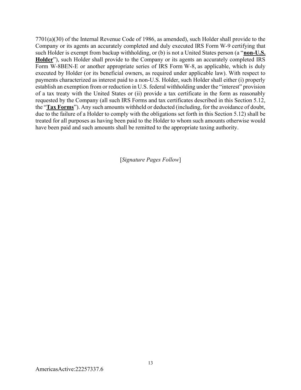 13 AmericasActive:22257337.6 7701(a)(30) of the Internal Revenue Code of 1986, as amended), such Holder shall provide to the Company or its agents an accurately completed and duly executed IRS Form W-9 certifying that such Holder is exempt from backup withholding, or (b) is not a United States person (a “non-U.S. Holder”), such Holder shall provide to the Company or its agents an accurately completed IRS Form W-8BEN-E or another appropriate series of IRS Form W-8, as applicable, which is duly executed by Holder (or its beneficial owners, as required under applicable law). With respect to payments characterized as interest paid to a non-U.S. Holder, such Holder shall either (i) properly establish an exemption from or reduction in U.S. federal withholding under the “interest” provision of a tax treaty with the United States or (ii) provide a tax certificate in the form as reasonably requested by the Company (all such IRS Forms and tax certificates described in this Section 5.12, the “Tax Forms”). Any such amounts withheld or deducted (including, for the avoidance of doubt, due to the failure of a Holder to comply with the obligations set forth in this Section 5.12) shall be treated for all purposes as having been paid to the Holder to whom such amounts otherwise would have been paid and such amounts shall be remitted to the appropriate taxing authority. [Signature Pages Follow]