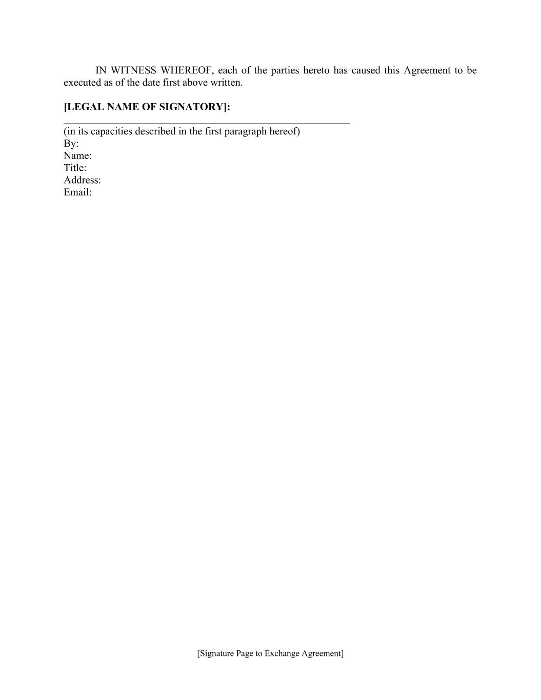 [Signature Page to Exchange Agreement] IN WITNESS WHEREOF, each of the parties hereto has caused this Agreement to be executed as of the date first above written. [LEGAL NAME OF SIGNATORY]: (in its capacities described in the first paragraph hereof) By: Name: Title: Address: Email: