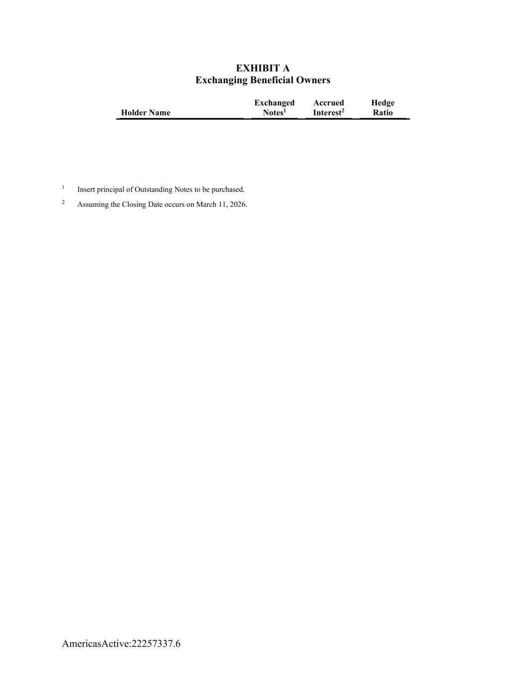 AmericasActive:22257337.6 EXHIBIT A Exchanging Beneficial Owners Holder Name Exchanged Notes1 Accrued Interest2 Hedge Ratio 1 Insert principal of Outstanding Notes to be purchased. 2 Assuming the Closing Date occurs on March 11, 2026.
