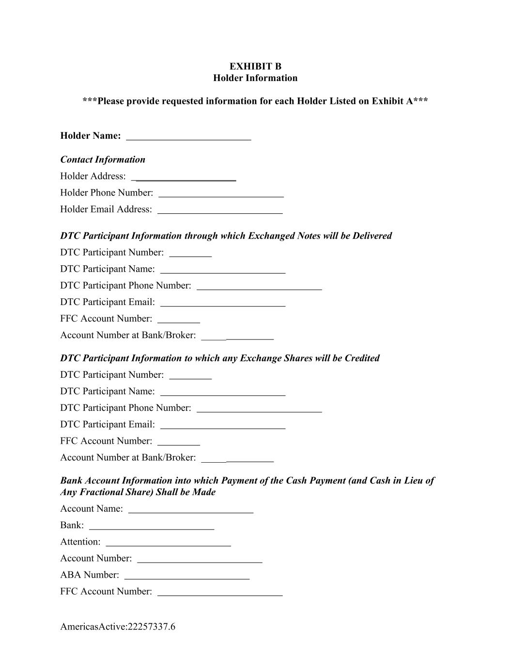 AmericasActive:22257337.6 EXHIBIT B Holder Information ***Please provide requested information for each Holder Listed on Exhibit A*** Holder Name: Contact Information Holder Address: ____________________ Holder Phone Number: Holder Email Address: DTC Participant Information through which Exchanged Notes will be Delivered DTC Participant Number: DTC Participant Name: DTC Participant Phone Number: DTC Participant Email: FFC Account Number: Account Number at Bank/Broker: _____ DTC Participant Information to which any Exchange Shares will be Credited DTC Participant Number: DTC Participant Name: DTC Participant Phone Number: DTC Participant Email: FFC Account Number: Account Number at Bank/Broker: _____ Bank Account Information into which Payment of the Cash Payment (and Cash in Lieu of Any Fractional Share) Shall be Made Account Name: Bank: Attention: Account Number: ABA Number: FFC Account Number: