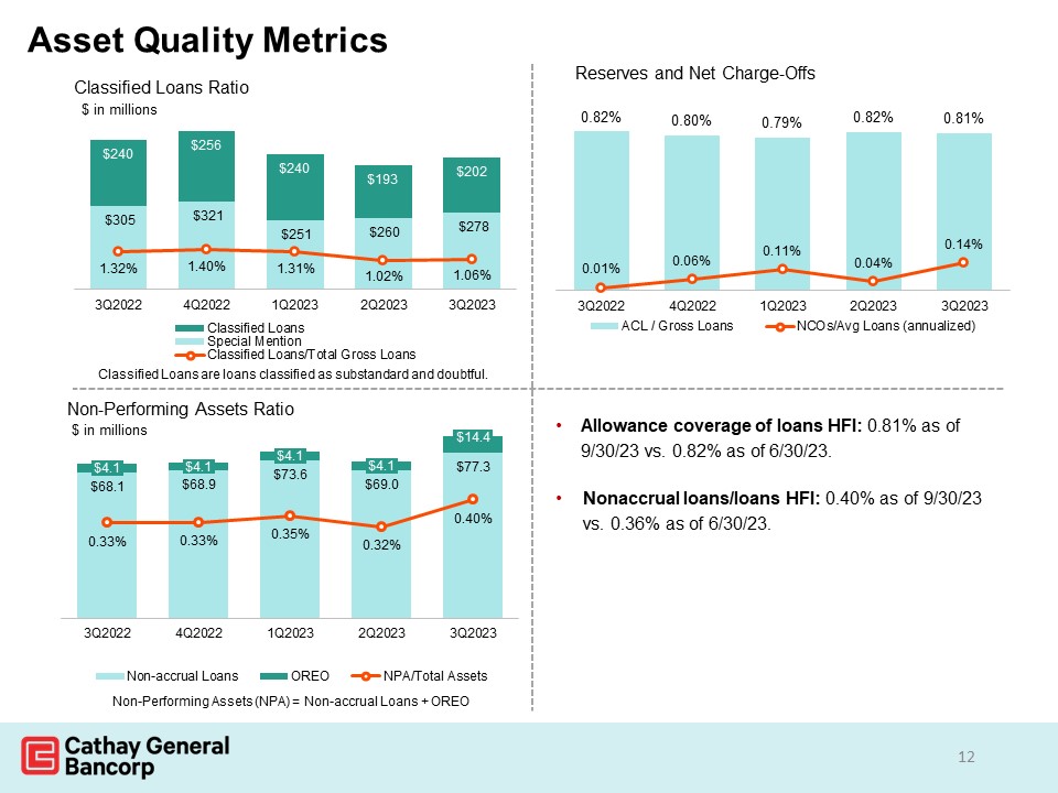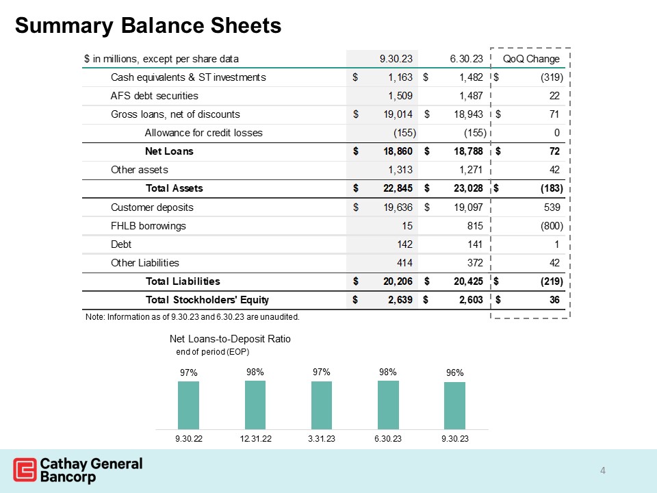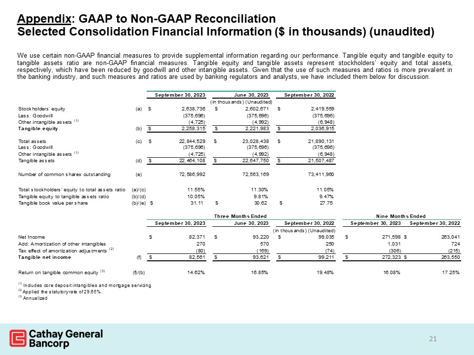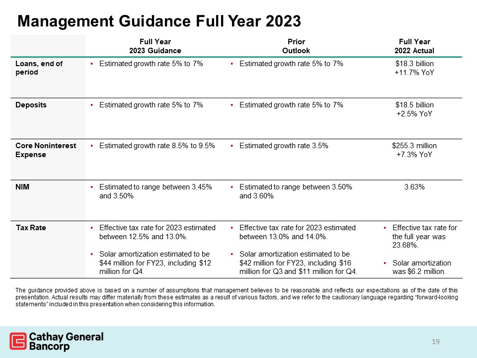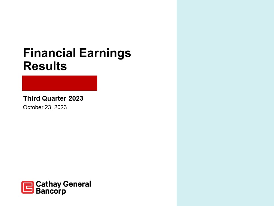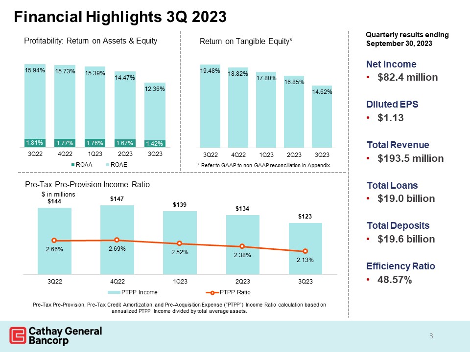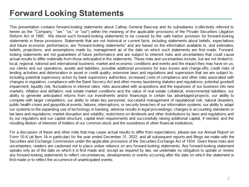 Forward Looking Statements  This presentation contains forward-looking statements about Cathay General Bancorp and its subsidiaries (collectively referred to herein as the “Company,” “we,” “us,” or “our”) within the meaning of the applicable provisions of the Private Securities Litigation Reform Act of 1995. We intend such forward-looking statements to be covered by the safe harbor provision for forward-looking statements in these provisions. Statements that are not historical or current facts, including statements about beliefs, expectations and future economic performance, are “forward-looking statements” and are based on the information available to, and estimates, beliefs, projections, and assumptions made by, management as of the date on which such statements are first made. Forward-looking statements are not guarantees of future performance and are subject to inherent risks and uncertainties that could cause actual results to differ materially from those anticipated in the statements. These risks and uncertainties include, but are not limited to: local, regional, national and international business, market and economic conditions and events and the impact they may have on us, our clients and our operations, assets and liabilities; possible additional provisions for loan losses and charge-offs; credit risks of lending activities and deterioration in asset or credit quality; extensive laws and regulations and supervision that we are subject to, including potential supervisory action by bank supervisory authorities; increased costs of compliance and other risks associated with changes in regulation; compliance with the Bank Secrecy Act and other money laundering statutes and regulations; potential goodwill impairment; liquidity risk; fluctuations in interest rates; risks associated with acquisitions and the expansion of our business into new markets; inflation and deflation; real estate market conditions and the value of real estate collateral; environmental liabilities; our ability to generate anticipated returns from our investments and/or financings in certain tax advantaged-projects; our ability to compete with larger competitors; our ability to retain key personnel; successful management of reputational risk; natural disasters, public health crises and geopolitical events; failures, interruptions, or security breaches of our information systems; our ability to adapt our systems to the expanding use of technology in banking; adverse results in legal proceedings; changes in accounting standards or tax laws and regulations; market disruption and volatility; restrictions on dividends and other distributions by laws and regulations and by our regulators and our capital structure; capital level requirements and successfully raising additional capital, if needed, and the resulting dilution of interests of holders of our common stock; and the soundness of other financial institutions.  For a discussion of these and other risks that may cause actual results to differ from expectations, please see our Annual Report on Form 10-K (at Item 1A in particular) for the year ended December 31, 2022, and all subsequent reports and filings we make with the Securities and Exchange Commission under the applicable provisions of the Securities Exchange Act of 1934. Given these risks and uncertainties, readers are cautioned not to place undue reliance on any forward-looking statements. Any forward-looking statement speaks only as of the date on which it is first made and, except as required by law, we undertake no obligation to update or review any forward-looking statements to reflect circumstances, developments or events occurring after the date on which the statement is first made or to reflect the occurrence of unanticipated events.  2