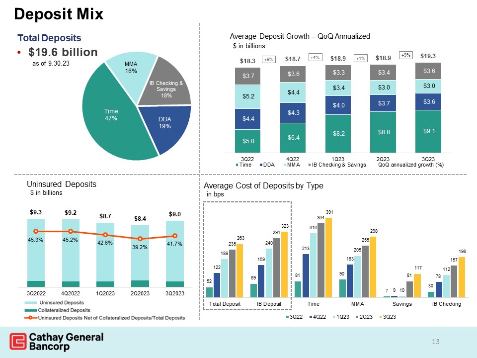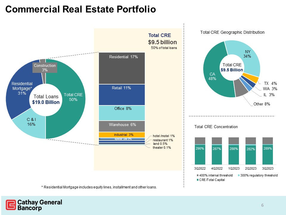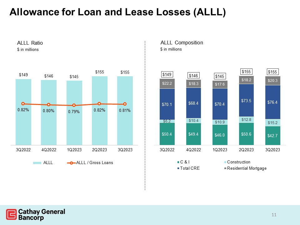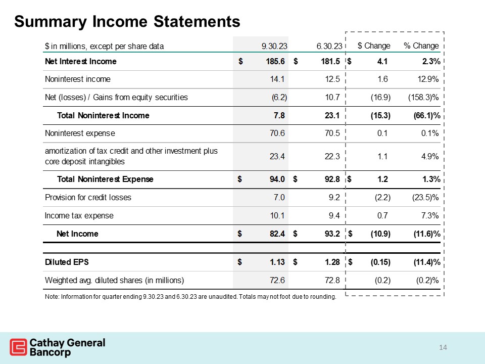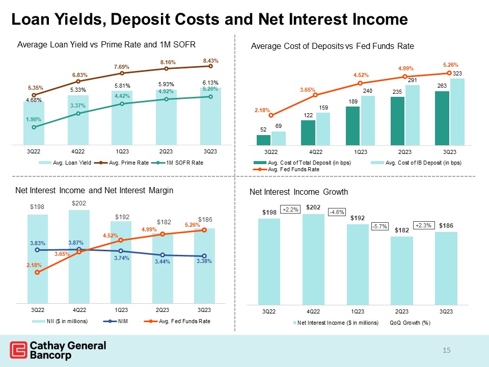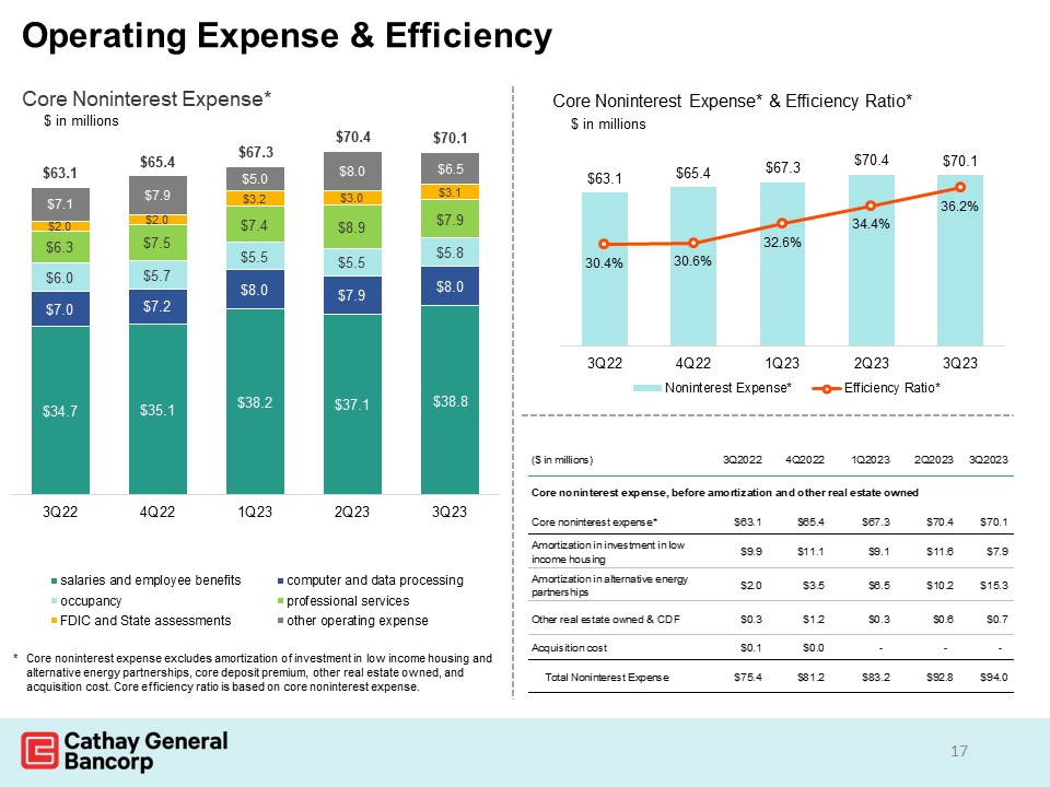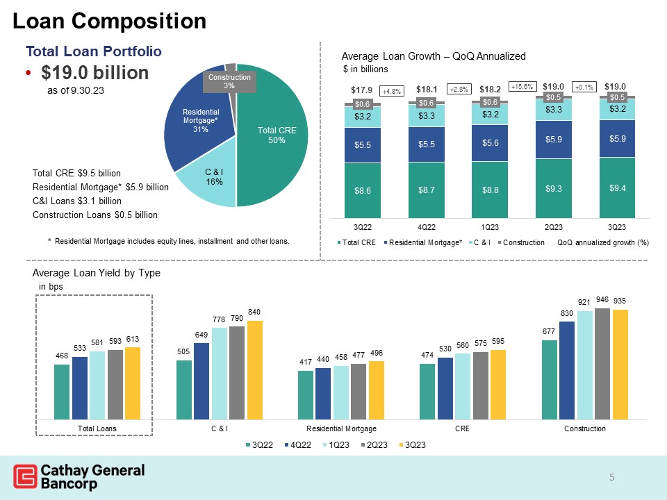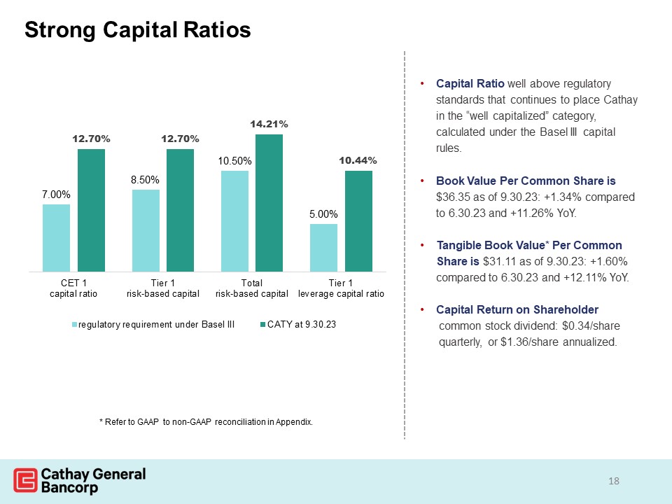 Forward Looking Statements  This presentation contains forward-looking statements about Cathay General Bancorp and its subsidiaries (collectively referred to herein as the “Company,” “we,” “us,” or “our”) within the meaning of the applicable provisions of the Private Securities Litigation Reform Act of 1995. We intend such forward-looking statements to be covered by the safe harbor provision for forward-looking statements in these provisions. Statements that are not historical or current facts, including statements about beliefs, expectations and future economic performance, are “forward-looking statements” and are based on the information available to, and estimates, beliefs, projections, and assumptions made by, management as of the date on which such statements are first made. Forward-looking statements are not guarantees of future performance and are subject to inherent risks and uncertainties that could cause actual results to differ materially from those anticipated in the statements. These risks and uncertainties include, but are not limited to: local, regional, national and international business, market and economic conditions and events and the impact they may have on us, our clients and our operations, assets and liabilities; possible additional provisions for loan losses and charge-offs; credit risks of lending activities and deterioration in asset or credit quality; extensive laws and regulations and supervision that we are subject to, including potential supervisory action by bank supervisory authorities; increased costs of compliance and other risks associated with changes in regulation; compliance with the Bank Secrecy Act and other money laundering statutes and regulations; potential goodwill impairment; liquidity risk; fluctuations in interest rates; risks associated with acquisitions and the expansion of our business into new markets; inflation and deflation; real estate market conditions and the value of real estate collateral; environmental liabilities; our ability to generate anticipated returns from our investments and/or financings in certain tax advantaged-projects; our ability to compete with larger competitors; our ability to retain key personnel; successful management of reputational risk; natural disasters, public health crises and geopolitical events; failures, interruptions, or security breaches of our information systems; our ability to adapt our systems to the expanding use of technology in banking; adverse results in legal proceedings; changes in accounting standards or tax laws and regulations; market disruption and volatility; restrictions on dividends and other distributions by laws and regulations and by our regulators and our capital structure; capital level requirements and successfully raising additional capital, if needed, and the resulting dilution of interests of holders of our common stock; and the soundness of other financial institutions.  For a discussion of these and other risks that may cause actual results to differ from expectations, please see our Annual Report on Form 10-K (at Item 1A in particular) for the year ended December 31, 2022, and all subsequent reports and filings we make with the Securities and Exchange Commission under the applicable provisions of the Securities Exchange Act of 1934. Given these risks and uncertainties, readers are cautioned not to place undue reliance on any forward-looking statements. Any forward-looking statement speaks only as of the date on which it is first made and, except as required by law, we undertake no obligation to update or review any forward-looking statements to reflect circumstances, developments or events occurring after the date on which the statement is first made or to reflect the occurrence of unanticipated events.  2