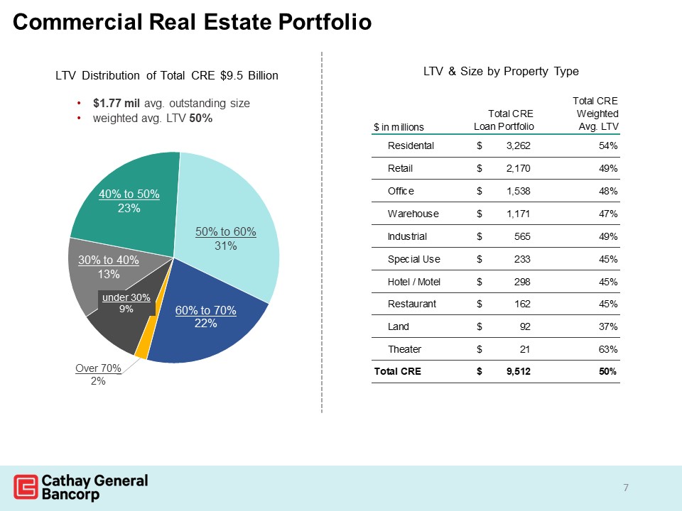 Commercial Real Estate Portfolio  Total CRE  $9.5 billion   50% of total loans  6  * Residential Mortgage includes equity lines, installment and other loans.