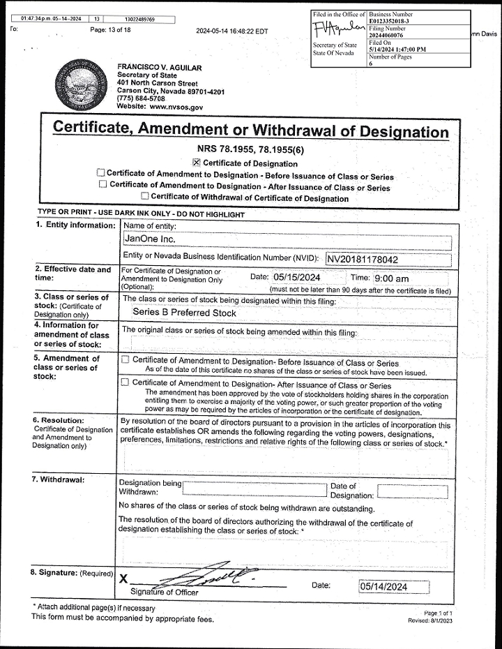 The undersigned, the Chief Executive Officer of JanOne Inc., a Nevada corporation (the “Company”), in accordance with the provisions of Section 78.1955 of the Nevada Revised Statutes, as amended, does hereby certify that, pursuant to the authority conferred upon the Board of Directors by the Articles of Incorporation of the Company, the following resolution creating a series of preferred stock, designated as Series B Preferred Stock, was duly adopted on May 10, 2024, as follows: