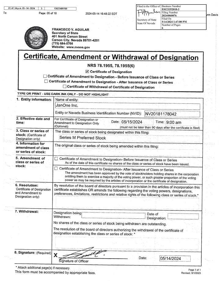 The undersigned, the Chief Executive Officer of JanOne Inc., a Nevada corporation (the “Company”), in accordance with the provisions of Section 78.1955 of the Nevada Revised Statutes, as amended, does hereby certify that, pursuant to the authority conferred upon the Board of Directors by the Articles of Incorporation of the Company, the following resolution creating a series of preferred stock, designated as Series M Preferred Stock, was duly adopted on May 10, 2024, as follows: