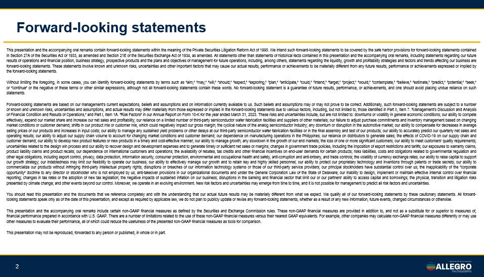 Forward - looking statements This presentation and the accompanying oral remarks contain forward - looking statements within the meaning of the Private Securities Litigation Reform Act of 1995 . We intend such forward - looking statements to be covered by the safe harbor provisions for forward - looking statements contained in Section 27 A of the Securities Act of 1933 , as amended and Section 21 E of the Securities Exchange Act of 1934 , as amended . All statements other than statements of historical facts contained in this presentation and the accompanying oral remarks, including statements regarding our future results of operations and financial position, business strategy, prospective products and the plans and objectives of management for future operations, including, among others, statements regarding the liquidity, growth and profitability strategies and factors and trends affecting our business are forward - looking statements . These statements involve known and unknown risks, uncertainties and other important factors that may cause our actual results, performance or achievements to be materially different from any future results, performance or achievements expressed or implied by the forward - looking statements . Without limiting the foregoing, in some cases, you can identify forward - looking statements by terms such as “aim,” “may,” “will,” “should,” “expect,” “exploring,” “plan,” “anticipate,” “could,” “intend,” “target,” “project,” “would,” “contemplate,” “believe,” “estimate,” “predict,” “potential,” “seek,” or “continue” or the negative of these terms or other similar expressions, although not all forward - looking statements contain these words . No forward - looking statement is a guarantee of future results, performance, or achievements, and one should avoid placing undue reliance on such statements . Forward - looking statements are based on our management’s current expectations, beliefs and assumptions and on information currently available to us . Such beliefs and assumptions may or may not prove to be correct . Additionally, such forward - looking statements are subject to a number of known and unknown risks, uncertainties and assumptions, and actual results may differ materially from those expressed or implied in the forward - looking statements due to various factors, including, but not limited to, those identified in Part II, Item 7 . “Management’s Discussion and Analysis of Financial Condition and Results of Operations,” and Part I, Item 1 A . “Risk Factors” in our Annual Report on Form 10 - K for the year ended March 31 , 2023 . These risks and uncertainties include, but are not limited to : downturns or volatility in general economic conditions ; our ability to compete effectively, expand our market share and increase our net sales and profitability ; our reliance on a limited number of third - party semiconductor wafer fabrication facilities and suppliers of other materials ; our failure to adjust purchase commitments and inventory management based on changing market conditions or customer demand ; shifts in our product mix or customer mix, which could negatively impact our gross margin ; the cyclical nature of the analog semiconductor industry ; any downturn or disruption in the automotive market ; our ability to compensate for decreases in average selling prices of our products and increases in input costs ; our ability to manage any sustained yield problems or other delays at our third - party semiconductor wafer fabrication facilities or in the final assembly and test of our products ; our ability to accurately predict our quarterly net sales and operating results ; our ability to adjust our supply chain volume to account for changing market conditions and customer demand ; our dependence on manufacturing operations in the Philippines ; our reliance on distributors to generate sales ; the effects of COVID - 19 on our supply chain and customer demand ; our ability to develop new product features or new products in a timely and cost - effective manner ; our ability to manage growth ; any slowdown in the growth of our end markets ; the loss of one or more significant customers ; our ability to meet customers’ quality requirements ; uncertainties related to the design win process and our ability to recover design and development expenses and to generate timely or sufficient net sales or margins ; changes in government trade policies, including the imposition of export restrictions and tariffs ; our exposures to warranty claims, product liability claims and product recalls ; our dependence on international customers and operations ; the availability of rebates, tax credits and other financial incentives on end - user demands for certain products ; risks liabilities, costs and obligations related to governmental regulation and other legal obligations, including export control, privacy, data protection, information security, consumer protection, environmental and occupational health and safety, anti - corruption and anti - bribery, and trade controls ; the volatility of currency exchange rates ; our ability to raise capital to support our growth strategy ; our indebtedness may limit our flexibility to operate our business ; our ability to effectively manage our growth and to retain key and highly skilled personnel ; our ability to protect our proprietary technology and inventions through patents or trade secrets ; our ability to commercialize our products without infringing third - party intellectual property rights ; disruptions or breaches of our information technology systems or those of our third - party service providers ; our principal stockholders have substantial control over us ; the inapplicability of the “corporate opportunity” doctrine to any director or stockholder who is not employed by us ; anti - takeover provisions in our organizational documents