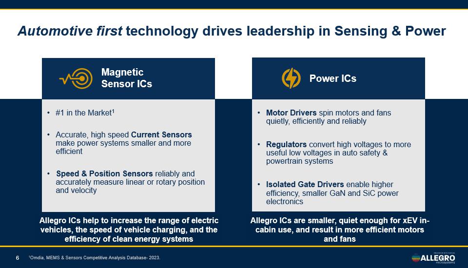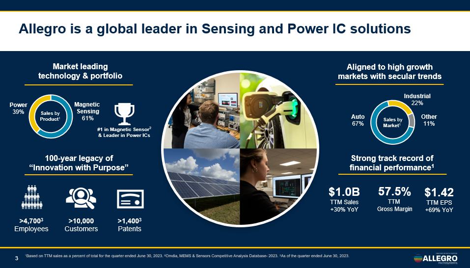 3 Allegro is a global leader in Sensing and Power IC solutions Magnetic Sensing 61% Power 39% Sales by Product 1 #1 in Magnetic Sensor 2 & Leader in Power ICs Market leading technology & portfolio Aligned to high growth markets with secular trends Sales by Market 1 $1.0B TTM Sales + 30 % YoY Strong track record of financial performance 1 57.5% TTM Gross Margin $1.42 TTM EPS + 69 % YoY Auto 67% 100 - year legacy of “Innovation with Purpose” >4,700 3 Employees >10,000 Customers >1,400 3 Patents Other 11% Industrial 22% 1 Based on TTM sales as a percent of total for the quarter ended June 30, 2023. 2 Omdia, MEMS & Sensors Competitive Analysis Database - 2023. 3 As of the quarter ended June 30, 2023.