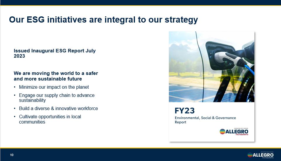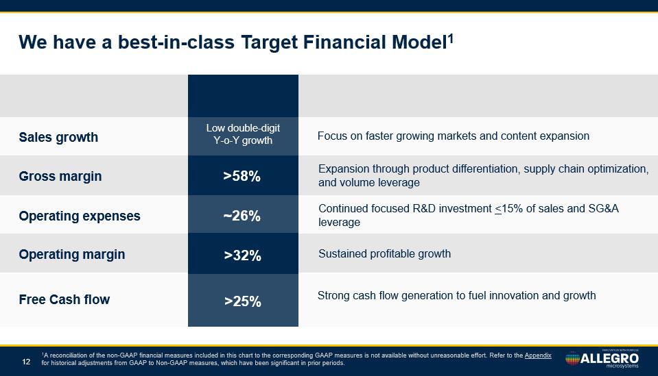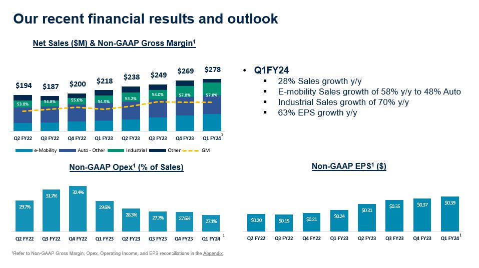 • Q1FY24 ▪ 28% Sales growth y/y ▪ E - mobility Sales growth of 58% y/y to 48% Auto ▪ Industrial Sales growth of 70% y/y ▪ 63% EPS growth y/y 1 Refer to Non - GAAP Gross Margin, Opex , Operating Income, and EPS reconciliations in the Appendix . $0.20 $0.19 $0.21 $0.24 $0.31 $0.35 $0.37 $0.39 Q2 FY22 Q3 FY22 Q4 FY22 Q1 FY23 Q2 FY23 Q3 FY23 Q4 FY23 Q1 FY24 Non - GAAP EPS 1 ($) 29.7% 31.7% 32.4% 29.6% 28.3% 27.7% 27.6% 27.1% Q2 FY22 Q3 FY22 Q4 FY22 Q1 FY23 Q2 FY23 Q3 FY23 Q4 FY23 Q1 FY24 Non - GAAP Opex 1 (% of Sales) Net Sales ($M) & Non - GAAP Gross Margin 1 $194 $187 $200 $218 $238 $249 $269 $278 53.8% 54.8% 55.6% 54.9% 56.2% 58.0% 57.8% 57.8% Q2 FY22 Q3 FY22 Q4 FY22 Q1 FY23 Q2 FY23 Q3 FY23 Q4 FY23 Q1 FY24 e-Mobility Auto - Other Industrial Other GM 1 1 1 Our recent financial results and outlook
