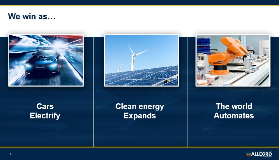 Automotive first technology drives leadership in Sensing & Power 6 • #1 in the Market 1 • Accurate, high speed Current Sensors make power systems smaller and more efficient • Speed & Position Sensors reliably and accurately measure linear or rotary position and velocity • Motor Drivers spin motors and fans quietly, efficiently and reliably • Regulators convert high voltages to more useful low voltages in auto safety & powertrain systems • Isolated Gate Drivers enable higher efficiency, smaller GaN and SiC power electronics Magnetic Sensor ICs Power ICs 1 Omdia, MEMS & Sensors Competitive Analysis Database - 2023. Allegro ICs help to increase the range of electric vehicles, the speed of vehicle charging, and the efficiency of clean energy systems Allegro ICs are smaller, quiet enough for xEV in - cabin use, and result in more efficient motors and fans