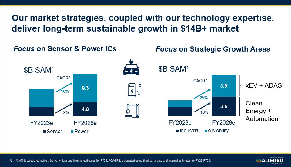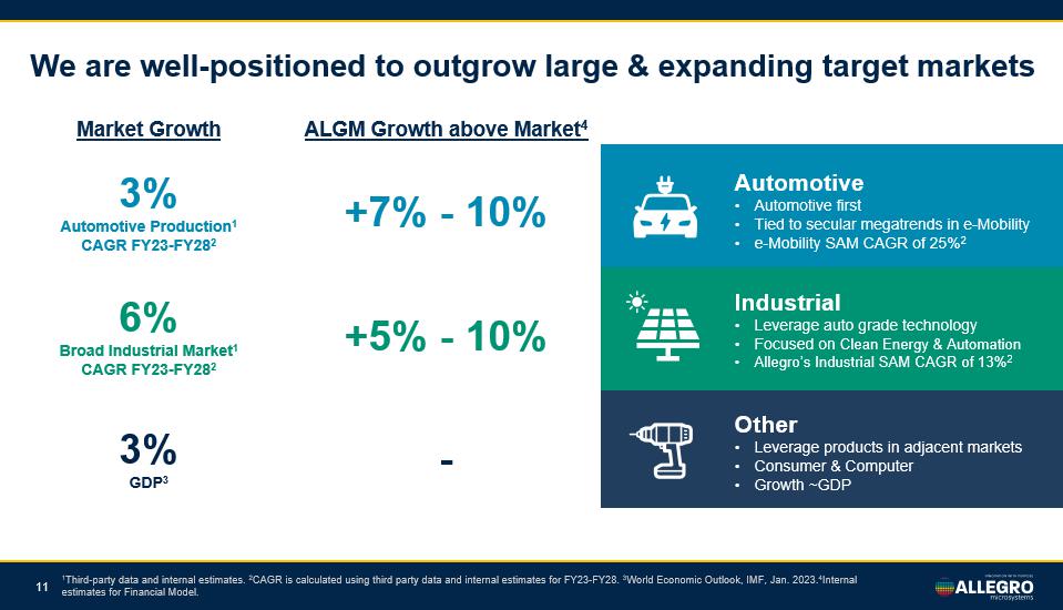 Industrial • Leverage auto grade technology • Focused on Clean Energy & Automation • Allegro’s Industrial SAM CAGR of 13% 2 Other • Leverage products in adjacent markets • Consumer & Computer • Growth ~GDP Automotive • Automotive first • Tied to secular megatrends in e - Mobility • e - Mobility SAM CAGR of 25% 2 We are well - positioned to outgrow large & expanding target markets 1 Third - party data and internal estimates. 2 CAGR is calculated using third party data and internal estimates for FY23 - FY28. 3 World Economic Outlook, IMF, Jan. 2023. 4 Internal estimates for Financial Model. Market Growth ALGM Growth above Market 4 3% Automotive Production 1 CAGR FY23 - FY28 2 +7% - 10% 6% Broad Industrial Market 1 CAGR FY23 - FY28 2 +5% - 10% 3% GDP 3 - 11