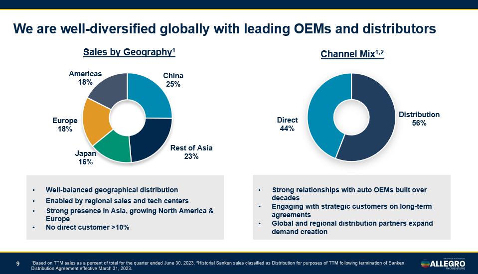 We are well - diversified globally with leading OEMs and distributors 1 Based on TTM sales as a percent of total for the quarter ended June 30, 2023. 2 Historial Sanken sales classified as Distribution for purposes of TTM following termination of Sanken Distribution Agreement effective March 31, 2023. Distribution 56% Direct 44% Channel Mix 1,2 • Strong relationships with auto OEMs built over decades • Engaging with strategic customers on long - term agreements • Global and regional distribution partners expand demand creation • Well - balanced geographical distribution • Enabled by regional sales and tech centers • Strong presence in Asia, growing North America & Europe • No direct customer >10% China 25% Rest of Asia 23% Japan 16% Europe 18% Americas 18% Sales by Geography 1 9