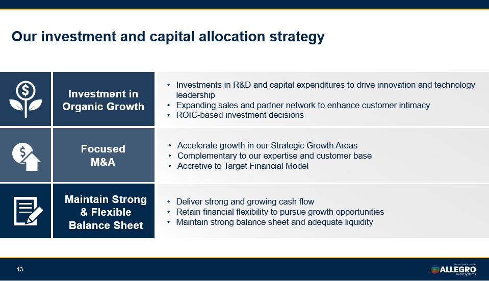Gross margin Operating margin Expansion through product differentiation, supply chain optimization, and volume leverage Sustained profitable growth >58% >32% Sales growth Focus on faster growing markets and content expansion Low double - digit Y - o - Y growth Operating expenses Continued focused R&D investment < 15% of sales and SG&A leverage ~26% Free Cash flow >25% Strong cash flow generation to fuel innovation and growth We have a best - in - class Target Financial Model 1 1 A reconciliation of the non - GAAP financial measures included in this chart to the corresponding GAAP measures is not available w ithout unreasonable effort. Refer to the Appendix for historical adjustments from GAAP to Non - GAAP measures, which have been significant in prior periods. 12
