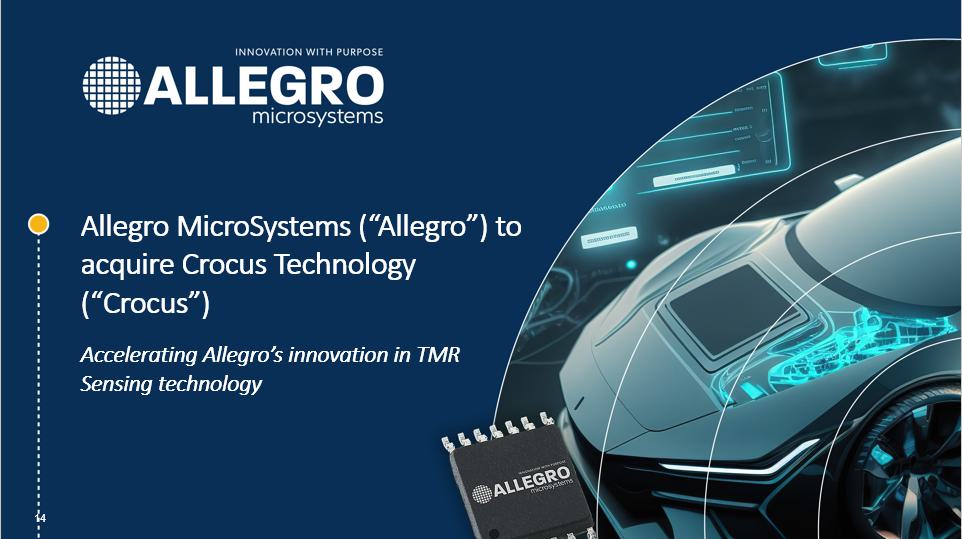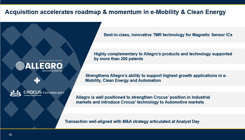 Accelerating Allegro’s innovation in TMR Sensing technology Allegro MicroSystems (“Allegro”) to acquire Crocus Technology (“Crocus”) 14