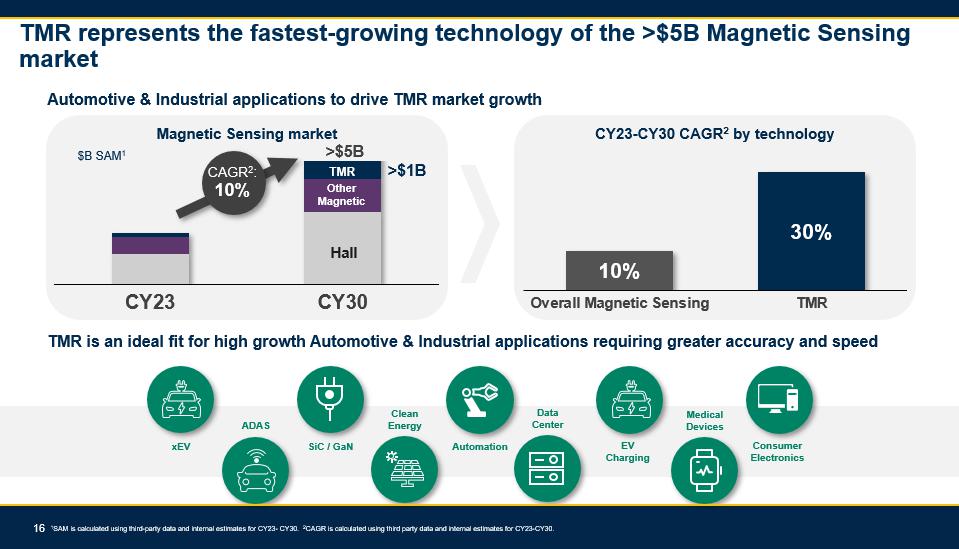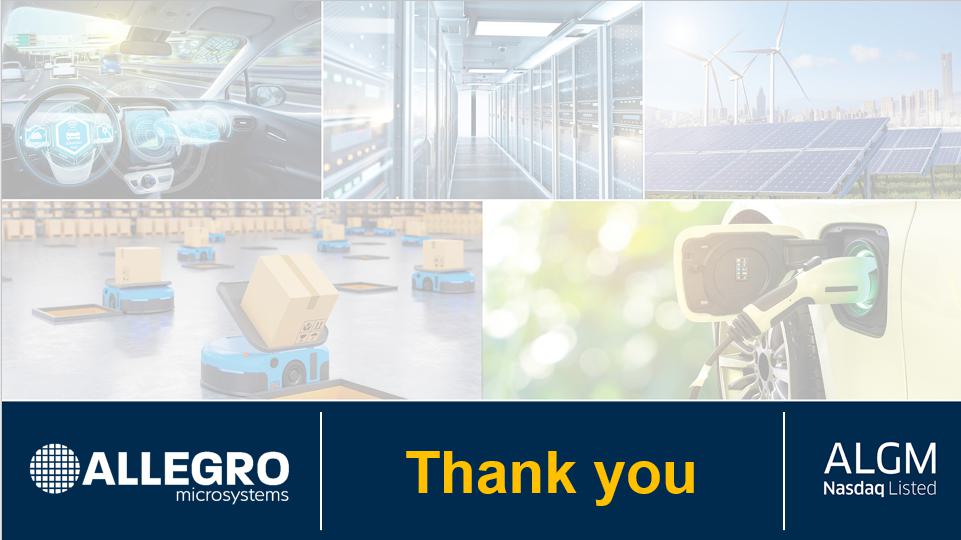 15 Acquisition accelerates roadmap & momentum in e - Mobility & Clean Energy Best - in - class, innovative TMR technology for Magnetic Sensor ICs Transaction well - aligned with M&A strategy articulated at Analyst Day Highly complementary to Allegro’s products and technology supported by more than 200 patents Strengthens Allegro’s ability to support highest growth applications in e - Mobility, Clean Energy and Automation Allegro is well positioned to strengthen Crocus’ position in Industrial markets and introduce Crocus' technology to Automotive markets 15
