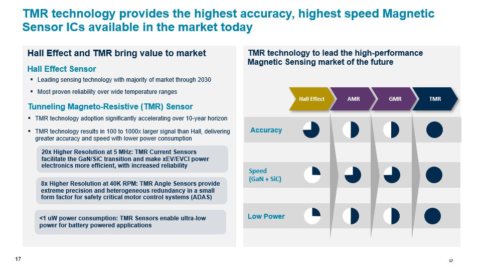 16 TMR represents the fastest - growing technology of the >$5B Magnetic Sensing market Automotive & Industrial applications to drive TMR market growth TMR is an ideal fit for high growth Automotive & Industrial applications requiring greater accuracy and speed xEV ADAS SiC / GaN Automation Clean Energy EV Charging Data Center Consumer Electronics Medical Devices 1 SAM is calculated using third - party data and internal estimates for CY23 - CY30. 2 CAGR is calculated using third party data and internal estimates for CY23 - CY30. 10% 30% Overall Magnetic Sensing TMR CY23 - CY30 CAGR 2 by technology CY23 CY30 CAGR 2 : 10% Magnetic Sensing market $B SAM 1 >$5B Hall Other Magnetic TMR >$1B 16