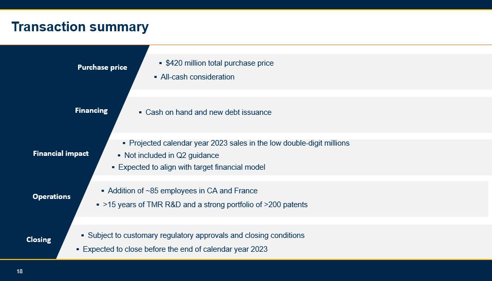 18 ▪ $420 million total purchase price ▪ All - cash consideration ▪ Cash on hand and new debt issuance ▪ Subject to customary regulatory approvals and closing conditions ▪ Expected to close before the end of calendar year 2023 Transaction summary Purchase price Financing Financial impact Closing ▪ Addition of ~85 employees in CA and France ▪ >15 years of TMR R&D and a strong portfolio of >200 patents Operations ▪ Projected calendar year 2023 sales in the low double - digit millions ▪ Not included in Q2 guidance ▪ Expected to align with target financial model 18