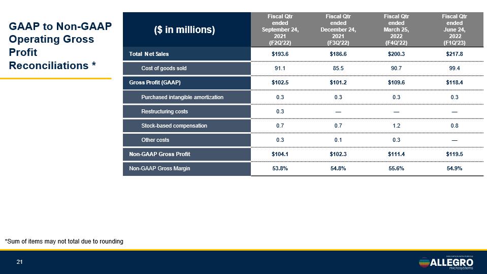 ($ in millions) Fiscal Qtr ended September 23, 2022 (F2Q’23) Fiscal Qtr ended December 23, 2022 (F3Q’23) Fiscal Qtr ended March 31, 2023 (F4Q’23) Fiscal Qtr ended June 30, 2023 (F1Q’24) TTM ended June 30, 2023 Total N et S ales $237.7 $248.8 $269.4 $278.3 $1,034.2 Cost of goods sold 105.6 106.2 116.4 120.3 448.5 Gross P rofit (GAAP) $132.0 $142.6 $153.1 158.0 585.7 Purchased intangible amortization 0.4 0.6 0.6 0.4 2.0 Stock - based compensation 1.1 1.2 2.0 2.6 6.9 Non - GAAP Gross Profit $133.5 $144.3 $155.7 $161.0 $594.5 Non - GAAP Gross Margin 56.2% 58.0% 57.8% 57.8% 57.5% 20 GAAP to Non - GAAP Operating Gross Profit Reconciliations * *Sum of items may not total due to rounding