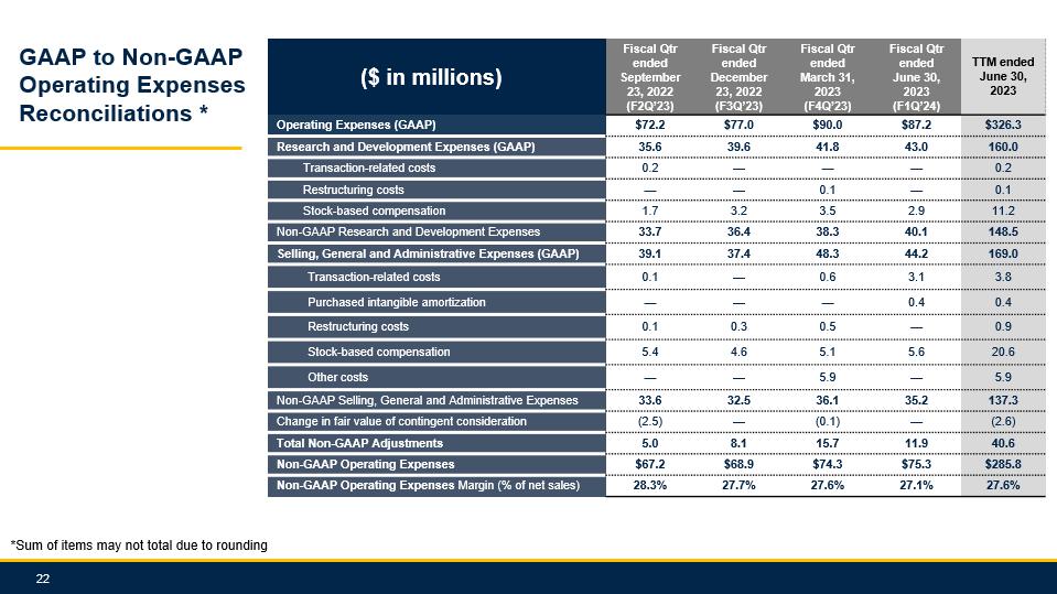 ($ in millions) Fiscal Qtr ended September 24, 2021 (F2Q’22) Fiscal Qtr ended December 24, 2021 (F3Q’22) Fiscal Qtr ended March 25, 2022 (F4Q’22) Fiscal Qtr ended June 24, 2022 (F1Q’23) Total N et S ales $193.6 $186.6 $200.3 $217.8 Cost of goods sold 91.1 85.5 90.7 99.4 Gross P rofit (GAAP) $102.5 $101.2 $109.6 $118.4 Purchased intangible amortization 0.3 0.3 0.3 0.3 Restructuring costs 0.3 — — — Stock - based compensation 0.7 0.7 1.2 0.8 Other costs 0.3 0.1 0.3 — Non - GAAP Gross Profit $104.1 $102.3 $111.4 $119.5 Non - GAAP Gross Margin 53.8% 54.8% 55.6% 54.9% 21 GAAP to Non - GAAP Operating Gross Profit Reconciliations * *Sum of items may not total due to rounding