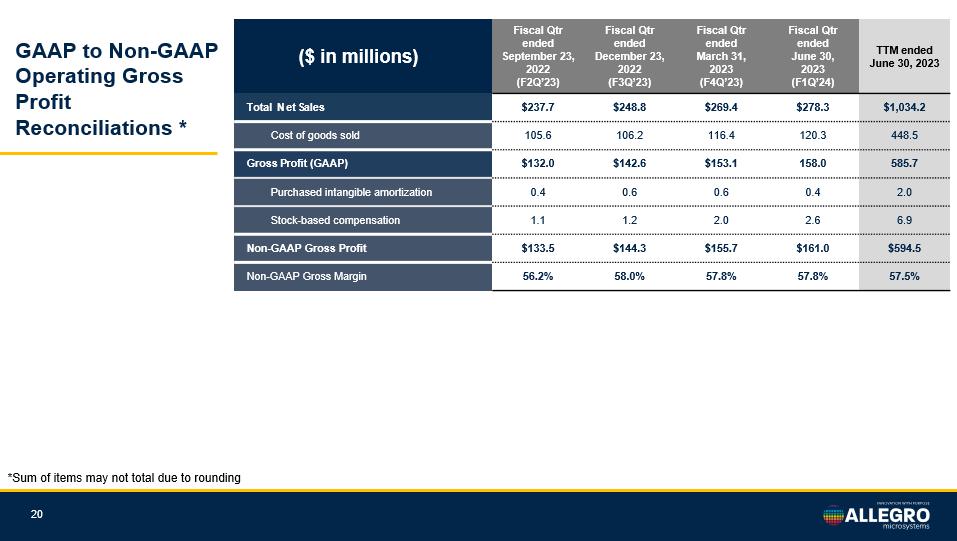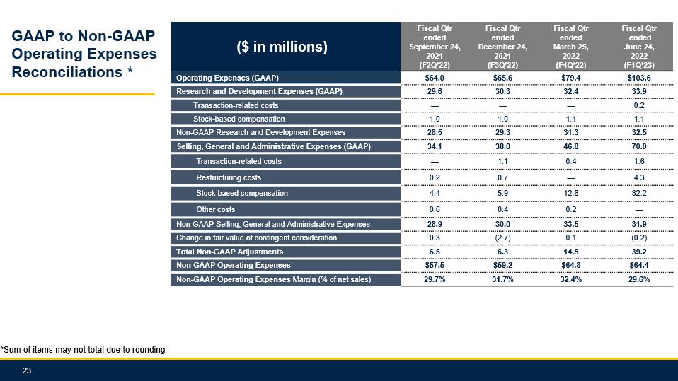 ($ in millions) Fiscal Qtr ended September 23, 2022 (F2Q’23) Fiscal Qtr ended December 23, 2022 (F3Q’23) Fiscal Qtr ended March 31, 2023 (F4Q’23) Fiscal Qtr ended June 30, 2023 (F1Q’24) TTM ended June 30, 2023 Operating Expenses (GAAP) $72.2 $77.0 $90.0 $87.2 $326.3 Research and Development Expenses (GAAP) 35.6 39.6 41.8 43.0 160.0 Transaction - related costs 0.2 — — — 0.2 Restructuring costs — — 0.1 — 0.1 Stock - based compensation 1.7 3.2 3.5 2.9 11.2 Non - GAAP Research and Development Expenses 33.7 36.4 38.3 40.1 148.5 Selling, General and Administrative Expenses (GAAP) 39.1 37.4 48.3 44.2 169.0 Transaction - related costs 0.1 — 0.6 3.1 3.8 Purchased intangible amortization — — — 0.4 0.4 Restructuring costs 0.1 0.3 0.5 — 0.9 Stock - based compensation 5.4 4.6 5.1 5.6 20.6 Other costs — — 5.9 — 5.9 Non - GAAP Selling, General and Administrative Expenses 33.6 32.5 36.1 35.2 137.3 Change in fair value of contingent consideration (2.5) — (0.1) — (2.6) Total Non - GAAP Adjustments 5.0 8.1 15.7 11.9 40.6 Non - GAAP Operating Expenses $67.2 $68.9 $74.3 $75.3 $285.8 Non - GAAP Operating Expenses Margin (% of net sales) 28.3% 27.7% 27.6% 27.1% 27.6% 22 GAAP to Non - GAAP Operating Expenses Reconciliations * *Sum of items may not total due to rounding