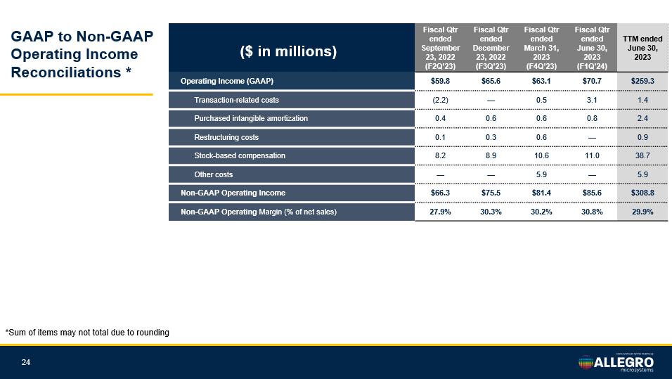 ($ in millions) Fiscal Qtr ended September 24, 2021 (F2Q’22) Fiscal Qtr ended December 24, 2021 (F3Q’22) Fiscal Qtr ended March 25, 2022 (F4Q’22) Fiscal Qtr ended June 24, 2022 (F1Q’23) Operating Expenses (GAAP) $64.0 $65.6 $79.4 $103.6 Research and Development Expenses (GAAP) 29.6 30.3 32.4 33.9 Transaction - related costs — — — 0.2 Stock - based compensation 1.0 1.0 1.1 1.1 Non - GAAP Research and Development Expenses 28.5 29.3 31.3 32.5 Selling, General and Administrative Expenses (GAAP) 34.1 38.0 46.8 70.0 Transaction - related costs — 1.1 0.4 1.6 Restructuring costs 0.2 0.7 — 4.3 Stock - based compensation 4.4 5.9 12.6 32.2 Other costs 0.6 0.4 0.2 — Non - GAAP Selling, General and Administrative Expenses 28.9 30.0 33.5 31.9 Change in fair value of contingent consideration 0.3 (2.7) 0.1 (0.2) Total Non - GAAP Adjustments 6.5 6.3 14.5 39.2 Non - GAAP Operating Expenses $57.5 $59.2 $64.8 $64.4 Non - GAAP Operating Expenses Margin (% of net sales) 29.7% 31.7% 32.4% 29.6% 23 GAAP to Non - GAAP Operating Expenses Reconciliations * *Sum of items may not total due to rounding