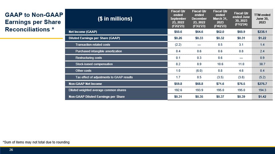($ in millions) Fiscal Qtr ended September 24, 2021 (F2Q’22) Fiscal Qtr ended December 24, 2021 (F3Q’22) Fiscal Qtr ended March 25, 2022 (F4Q’22) Fiscal Qtr ended June 24, 2022 (F1Q’23) Operating Income (GAAP) $38.6 $35.6 $30.2 $14.7 Transaction - related costs 0.3 (1.6) 0.5 1.6 Purchased intangible amortization 0.3 0.3 0.3 0.3 Restructuring costs 0.4 0.7 0.1 4.3 Stock - based compensation 6.2 7.6 14.9 34.1 Other costs 0.9 0.5 0.5 — Non - GAAP Operating Income $46.6 $43.1 $46.5 $55.0 Non - GAAP Operating Margin (% of net sales) 24.1% 23.1% 23.2% 25.3% 25 GAAP to Non - GAAP Operating Income Reconciliations * *Sum of items may not total due to rounding