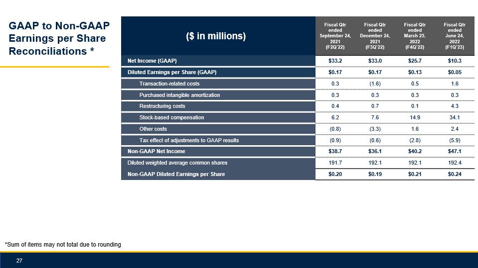 ($ in millions) Fiscal Qtr ended September 23, 2022 (F2Q’23) Fiscal Qtr ended December 23, 2022 (F3Q’23) Fiscal Qtr ended March 31, 2023 (F4Q’23) Fiscal Qtr ended June 30, 2023 (F1Q’24) TTM ended June 30, 2023 Net Income (GAAP) $50.6 $64.6 $62.0 $60.9 $238.1 Diluted Earnings per Share (GAAP) $0.26 $0.33 $0.32 $0.31 $1.22 Transaction - related costs (2.2) — 0.5 3.1 1.4 Purchased intangible amortization 0.4 0.6 0.6 0.8 2.4 Restructuring costs 0.1 0.3 0.6 — 0.9 Stock - based compensation 8.2 8.9 10.6 11.0 38.7 Other costs 1.0 (6.0) 0.8 4.6 0.4 Tax effect of adjustments to GAAP results 1.7 0.5 (3.5) (3.8) (5.2) Non - GAAP Net Income $59.8 $68.8 $71.6 $76.5 $276.7 Diluted weighted average common shares 192.6 193.9 195.0 195.0 194.3 Non - GAAP Diluted Earnings per Share $0.31 $0.35 $0.37 $0.39 $1.42 26 GAAP to Non - GAAP Earnings per Share Reconciliations * *Sum of items may not total due to rounding