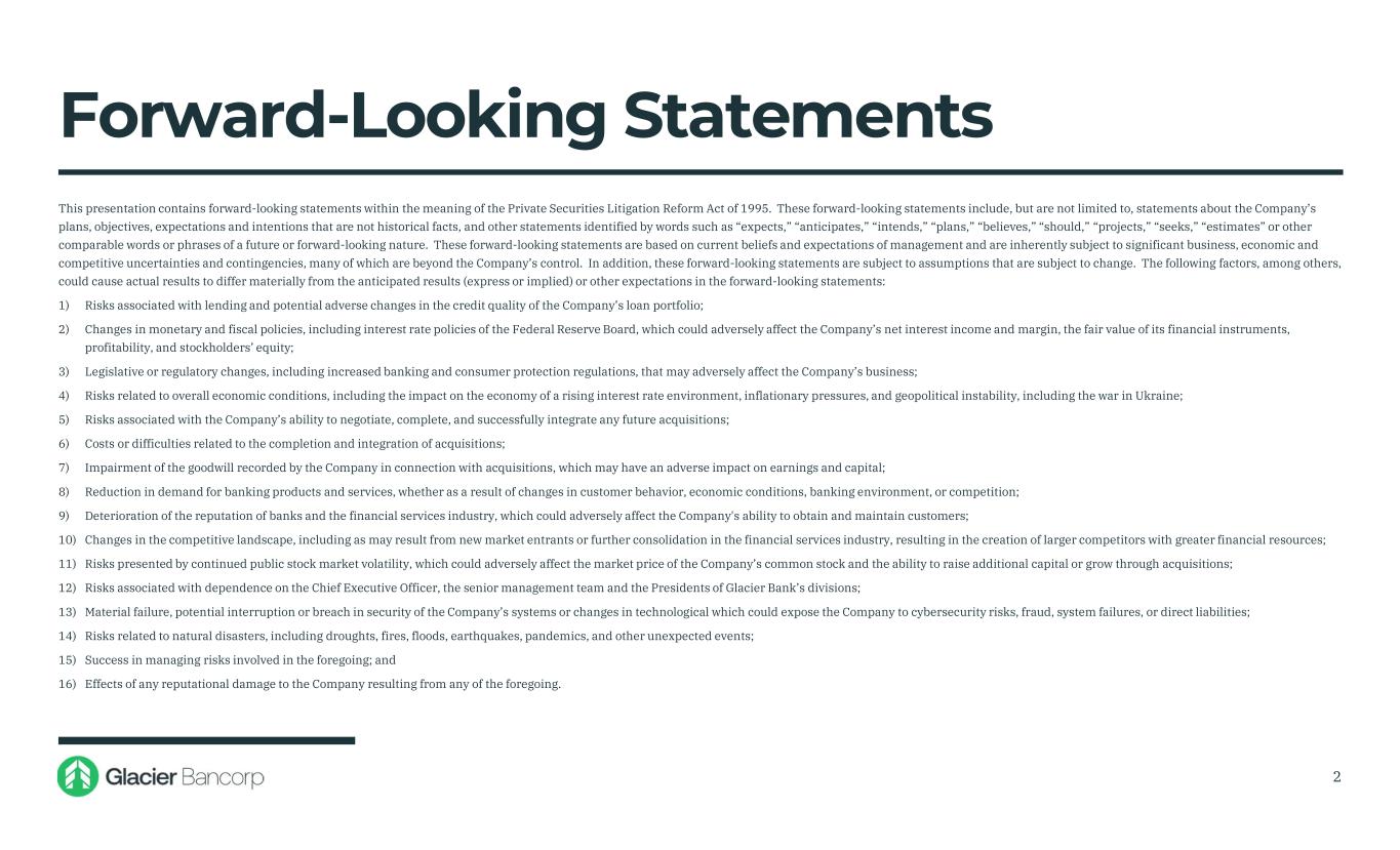 Forward-Looking Statements This presentation contains forward-looking statements within the meaning of the Private Securities Litigation Reform Act of 1995. These forward-looking statements include, but are not limited to, statements about the Company’s plans, objectives, expectations and intentions that are not historical facts, and other statements identified by words such as “expects,” “anticipates,” “intends,” “plans,” “believes,” “should,” “projects,” “seeks,” “estimates” or other comparable words or phrases of a future or forward-looking nature. These forward-looking statements are based on current beliefs and expectations of management and are inherently subject to significant business, economic and competitive uncertainties and contingencies, many of which are beyond the Company’s control. In addition, these forward-looking statements are subject to assumptions that are subject to change. The following factors, among others, could cause actual results to differ materially from the anticipated results (express or implied) or other expectations in the forward-looking statements: 1) Risks associated with lending and potential adverse changes in the credit quality of the Company’s loan portfolio; 2) Changes in monetary and fiscal policies, including interest rate policies of the Federal Reserve Board, which could adversely affect the Company’s net interest income and margin, the fair value of its financial instruments, profitability, and stockholders’ equity; 3) Legislative or regulatory changes, including increased banking and consumer protection regulations, that may adversely affect the Company’s business; 4) Risks related to overall economic conditions, including the impact on the economy of a rising interest rate environment, inflationary pressures, and geopolitical instability, including the war in Ukraine; 5) Risks associated with the Company’s ability to negotiate, complete, and successfully integrate any future acquisitions; 6) Costs or difficulties related to the completion and integration of acquisitions; 7) Impairment of the goodwill recorded by the Company in connection with acquisitions, which may have an adverse impact on earnings and capital; 8) Reduction in demand for banking products and services, whether as a result of changes in customer behavior, economic conditions, banking environment, or competition; 9) Deterioration of the reputation of banks and the financial services industry, which could adversely affect the Company's ability to obtain and maintain customers; 10) Changes in the competitive landscape, including as may result from new market entrants or further consolidation in the financial services industry, resulting in the creation of larger competitors with greater financial resources; 11) Risks presented by continued public stock market volatility, which could adversely affect the market price of the Company’s common stock and the ability to raise additional capital or grow through acquisitions; 12) Risks associated with dependence on the Chief Executive Officer, the senior management team and the Presidents of Glacier Bank’s divisions; 13) Material failure, potential interruption or breach in security of the Company’s systems or changes in technological which could expose the Company to cybersecurity risks, fraud, system failures, or direct liabilities; 14) Risks related to natural disasters, including droughts, fires, floods, earthquakes, pandemics, and other unexpected events; 15) Success in managing risks involved in the foregoing; and 16) Effects of any reputational damage to the Company resulting from any of the foregoing. 2
