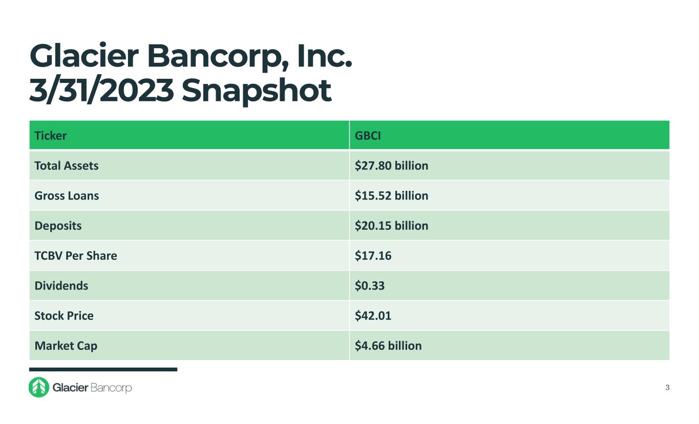 Glacier Bancorp, Inc. 3/31/2023 Snapshot Ticker GBCI Total Assets $27.80 billion Gross Loans $15.52 billion Deposits $20.15 billion TCBV Per Share $17.16 Dividends $0.33 Stock Price $42.01 Market Cap $4.66 billion 3