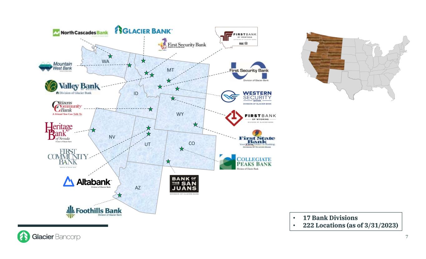 GBCI Acquisition History – Last 10 Years $7.7 $7.9 $8.3 $9.1 $9.5 $9.7 $12.1 $13.7 $18.5 $25.9 $26.6 $- $4 $8 $12 $16 $20 $24 $28 2012 2013 2014 2015 2016 2017 2018 2019 2020 2021 2022 Total Assets ($B) Acquisitions • Long history of adding high quality community banks that fit the Glacier banking model May 2013 $301M Assets July 2013 $330M Assets August 2014 $349M Assets February 2015 $176M Assets October 2015 $270M Assets October 2021 $4,132M Assets July 2019 $978M Assets April 2017 $386M Assets April 2019 $379M Assets February 2018 $1,110M Assets January 2018 $551M Assets February 2020 $745M Assets August 2016 $76M Assets Source: S&P Capital IQ Pro Note: Assets for acquired bank based on date of deal completion 6