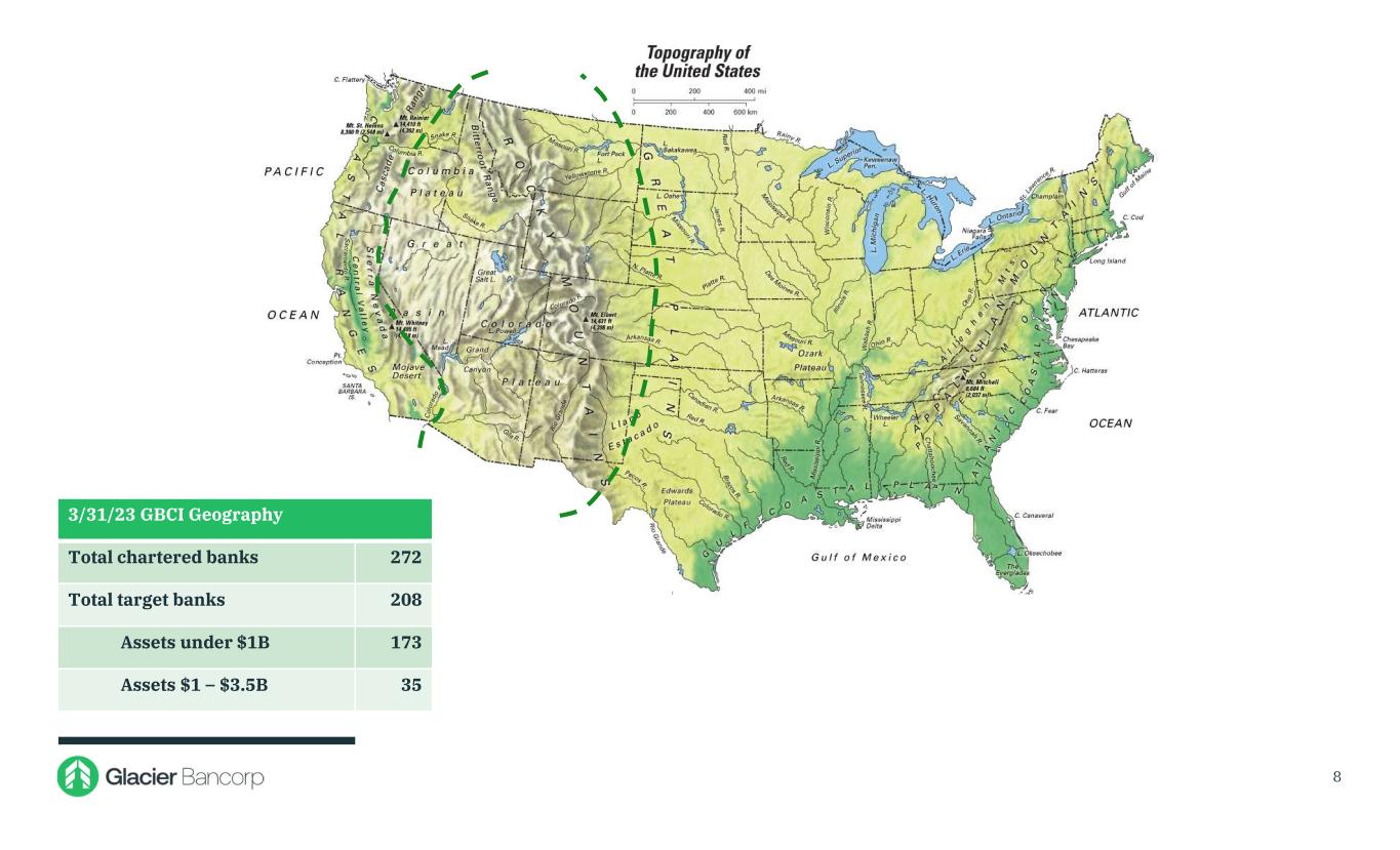3/31/23 GBCI Geography Total chartered banks 272 Total target banks 208 Assets under $1B 173 Assets $1 – $3.5B 35 8