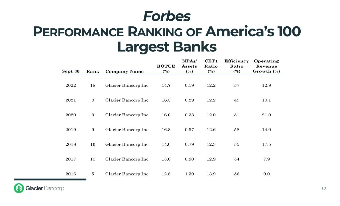 Forbes PERFORMANCE RANKING OF America’s 100 Largest Banks Sept 30 Rank Company Name ROTCE (%) NPAs/ Assets (%) CET1 Ratio (%) Efficiency Ratio (%) Operating Revenue Growth (%) 2022 18 Glacier Bancorp Inc. 14.7 0.19 12.2 57 12.9 2021 8 Glacier Bancorp Inc. 18.5 0.29 12.2 49 10.1 2020 3 Glacier Bancorp Inc. 16.0 0.33 12.0 51 21.0 2019 9 Glacier Bancorp Inc. 16.8 0.57 12.6 58 14.0 2018 16 Glacier Bancorp Inc. 14.0 0.79 12.3 55 17.5 2017 10 Glacier Bancorp Inc. 13.6 0.90 12.9 54 7.9 2016 5 Glacier Bancorp Inc. 12.8 1.30 13.9 56 9.0 13