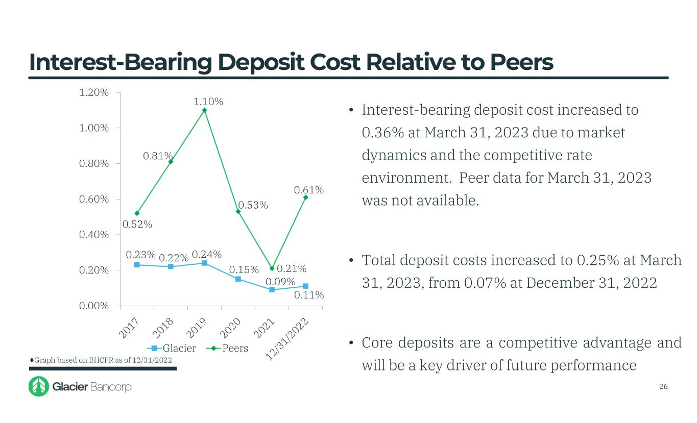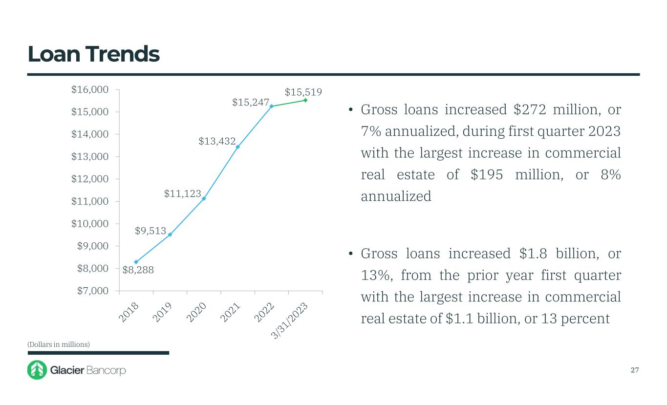 0.23% 0.22% 0.24% 0.15% 0.09% 0.11% 0.52% 0.81% 1.10% 0.53% 0.21% 0.61% 0.00% 0.20% 0.40% 0.60% 0.80% 1.00% 1.20% Glacier Peers • Interest-bearing deposit cost increased to 0.36% at March 31, 2023 due to market dynamics and the competitive rate environment. Peer data for March 31, 2023 was not available. • Total deposit costs increased to 0.25% at March 31, 2023, from 0.07% at December 31, 2022 • Core deposits are a competitive advantage and will be a key driver of future performance Interest-Bearing Deposit Cost Relative to Peers ♦Graph based on BHCPR as of 12/31/2022 26