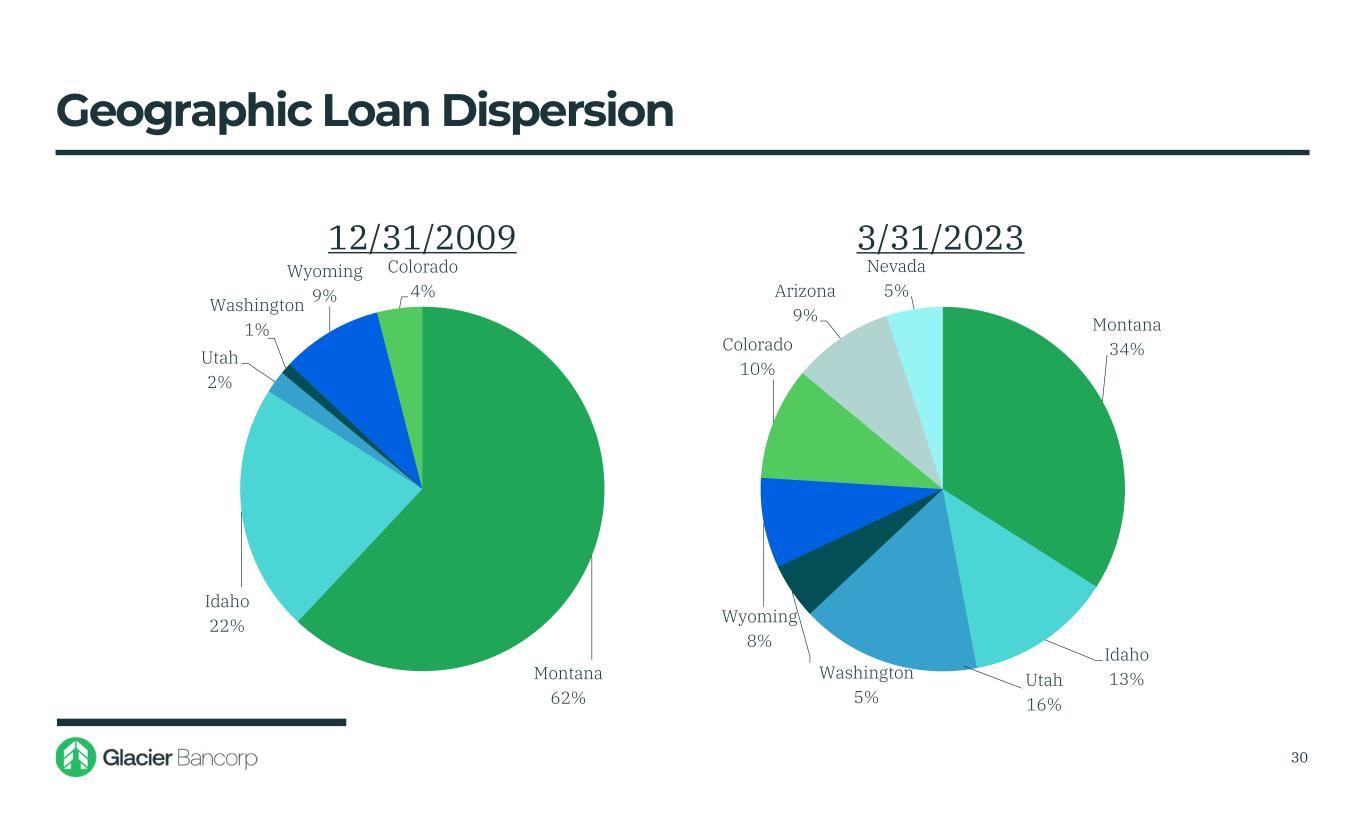 Montana 62% Idaho 22% Utah 2% Washington 1% Wyoming 9% Colorado 4% 12/31/2009 Montana 34% Idaho 13%Utah 16% Washington 5% Wyoming 8% Colorado 10% Arizona 9% Nevada 5% 3/31/2023 Geographic Loan Dispersion 30