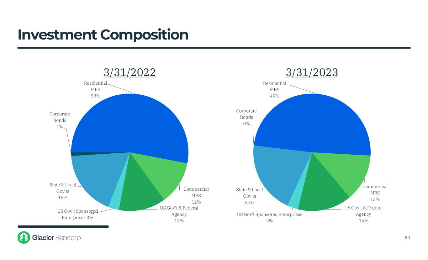 US Gov't & Federal Agency 13% US Gov't Sponsored Enterprises 3% State & Local Gov'ts 18% Corporate Bonds 1% Residential MBS 53% Commercial MBS 12% 3/31/2022 US Gov't & Federal Agency 15% US Gov't Sponsored Enterprises 3% State & Local Gov'ts 20% Corporate Bonds 0% Residential MBS 49% Commercial MBS 13% 3/31/2023 Investment Composition 32