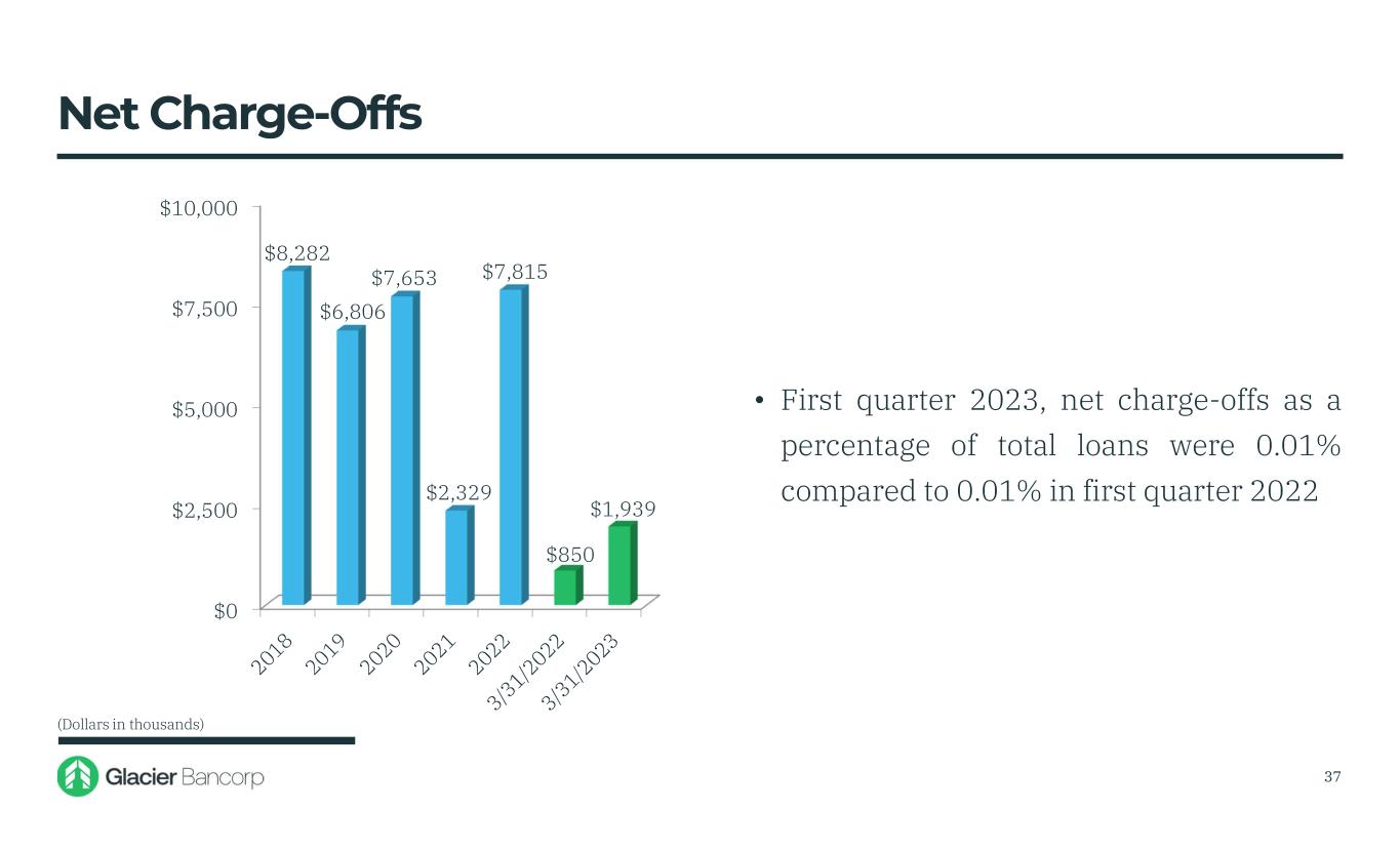 $0 $5,000 $10,000 $15,000 $20,000 $25,000 $30,000 $35,000 $40,000 $45,000 $9,953 $57 $39,765 $23,076 $19,963 $7,031 $5,470 • Loan portfolio growth, composition, average loan size, credit quality considerations, economic forecasts and other environmental factors will determine the future level of credit loss expense or benefit Provision For Credit Losses (Dollars in thousands) 36