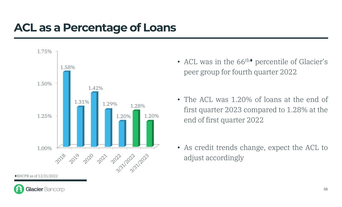 1.00% 1.25% 1.50% 1.75% 1.58% 1.31% 1.42% 1.29% 1.20% 1.28% 1.20% • ACL was in the 66th♦ percentile of Glacier’s peer group for fourth quarter 2022 • The ACL was 1.20% of loans at the end of first quarter 2023 compared to 1.28% at the end of first quarter 2022 • As credit trends change, expect the ACL to adjust accordingly ACL as a Percentage of Loans ♦BHCPR as of 12/31/2022 38