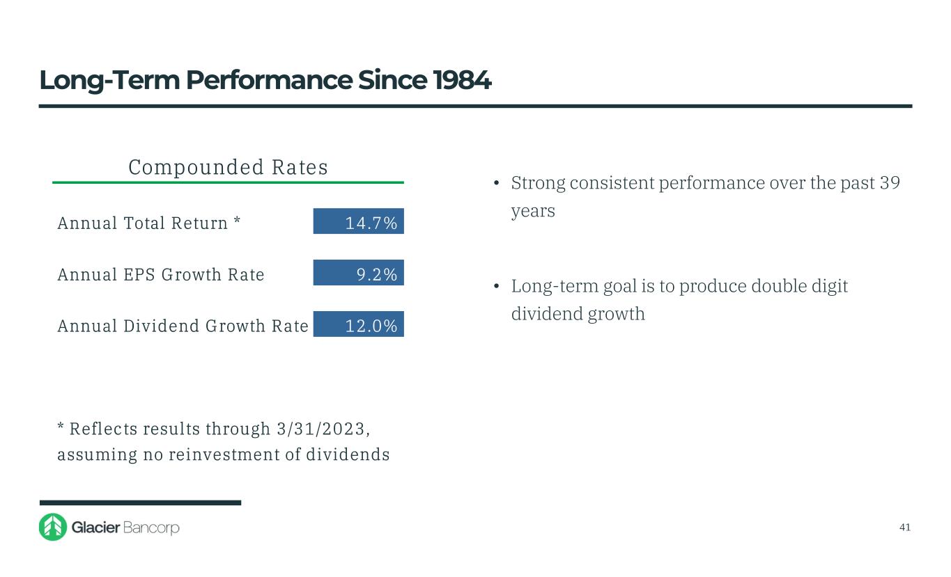 $0.50 $0.55 $0.60 $0.65 $0.70 $0.75 $0.80 $0.85 $0.90 $0.95 $1.00 $1.05 $1.10 $1.15 $1.20 $1.25 $1.30 $1.35 • At March 31, 2023, Glacier’s dividend yield was 3.19% • The Company has declared 152 consecutive quarterly dividends • In 2022, the Company increased its quarterly dividend by $0.05, or 3.9%, over 2021 Dividends Declared 40