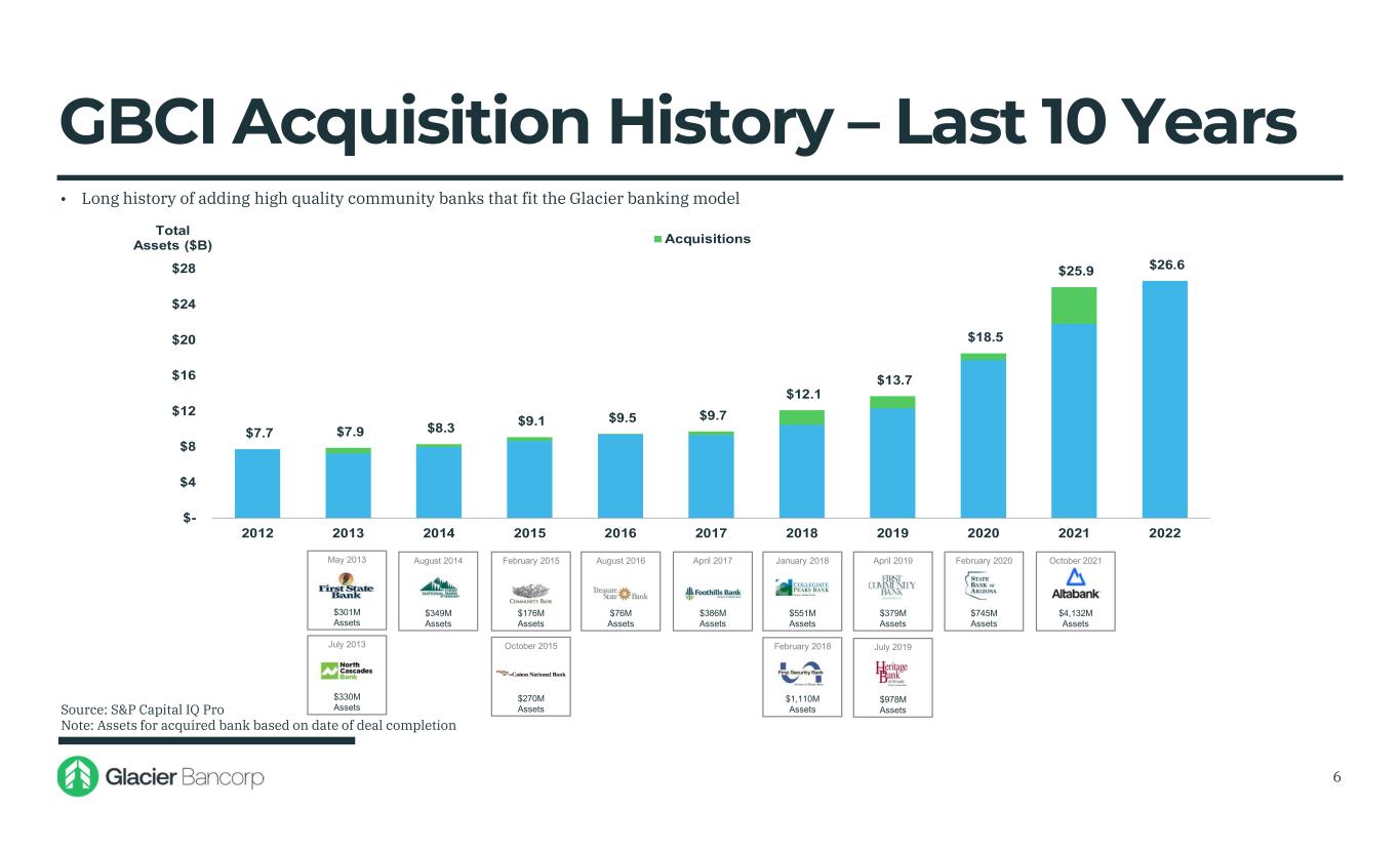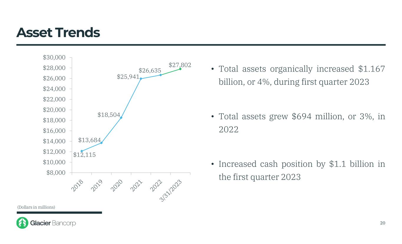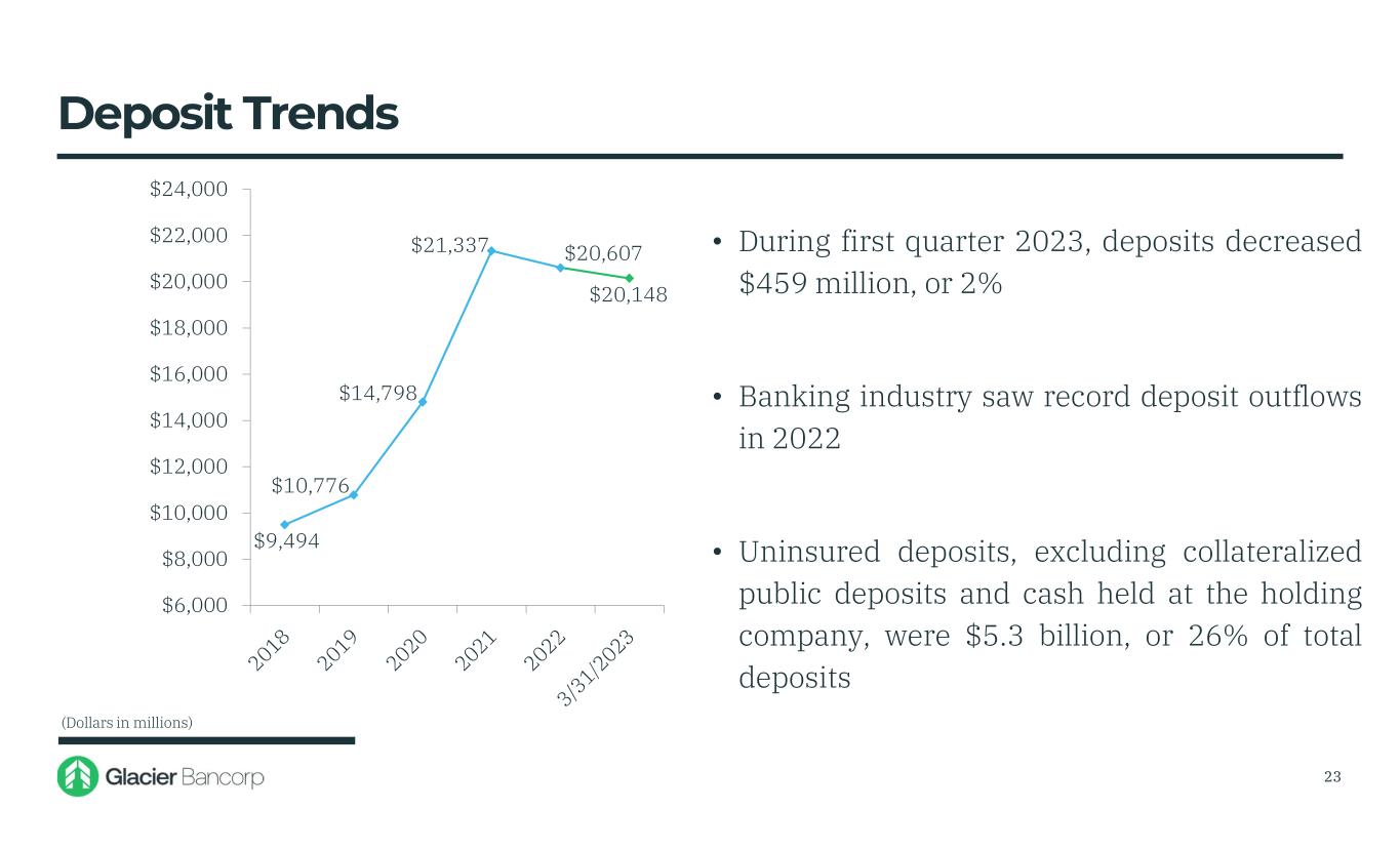 Glacier Bancorp, Inc. 3/31/2023 Snapshot Ticker GBCI Total Assets $27.80 billion Gross Loans $15.52 billion Deposits $20.15 billion TCBV Per Share $17.16 Dividends $0.33 Stock Price $42.01 Market Cap $4.66 billion 3