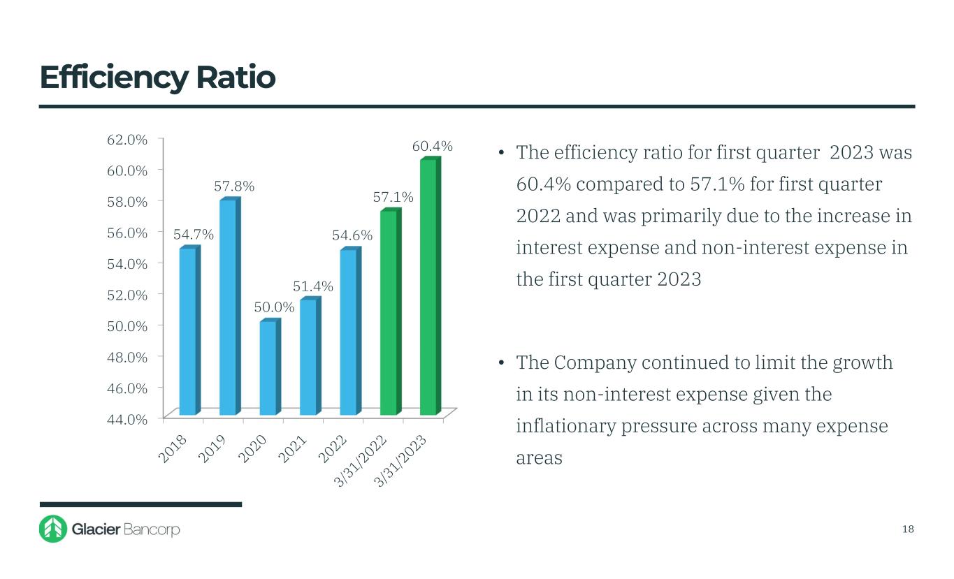 $100 $200 $300 $400 $500 $600 $700 $800 $900 $433 $503 $600 $663 $788 $753 $755 4.21% 4.39% 4.09% 3.42% 3.27% 3.20% 3.08% • First quarter 2023 net interest income of $755 million increased $3 million, or 0.34%, over net interest income of $753 million for first quarter 2022 • First quarter 2023 net interest margin of 3.08% decreased 12 basis points over the net interest margin of 3.20% for first quarter 2022 17 Net Interest Income / Margin* (Dollars in millions) *Net interest income and margin are annualized