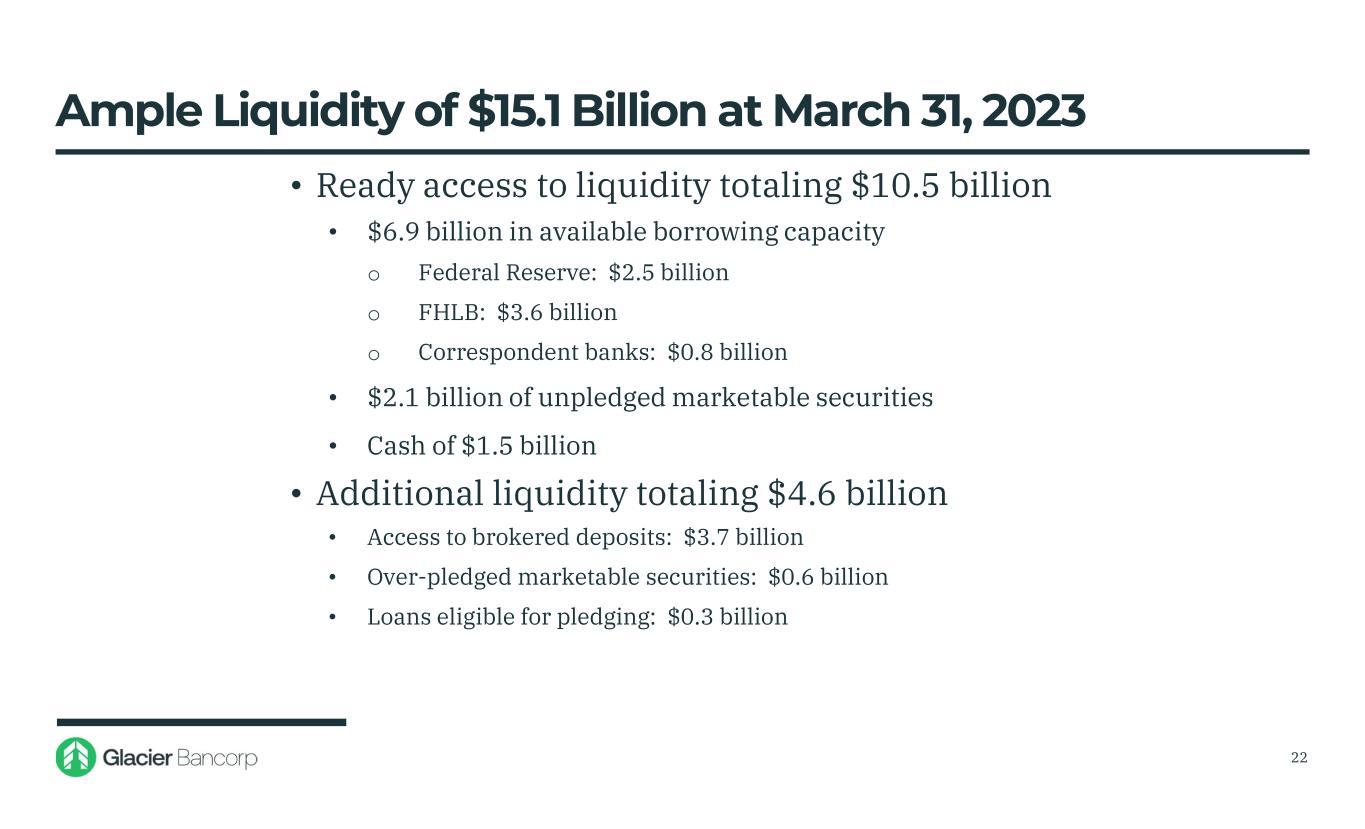Ample Liquidity of $15.1 Billion at March 31, 2023 • Ready access to liquidity totaling $10.5 billion • $6.9 billion in available borrowing capacity o Federal Reserve: $2.5 billion o FHLB: $3.6 billion o Correspondent banks: $0.8 billion • $2.1 billion of unpledged marketable securities • Cash of $1.5 billion • Additional liquidity totaling $4.6 billion • Access to brokered deposits: $3.7 billion • Over-pledged marketable securities: $0.6 billion • Loans eligible for pledging: $0.3 billion 22