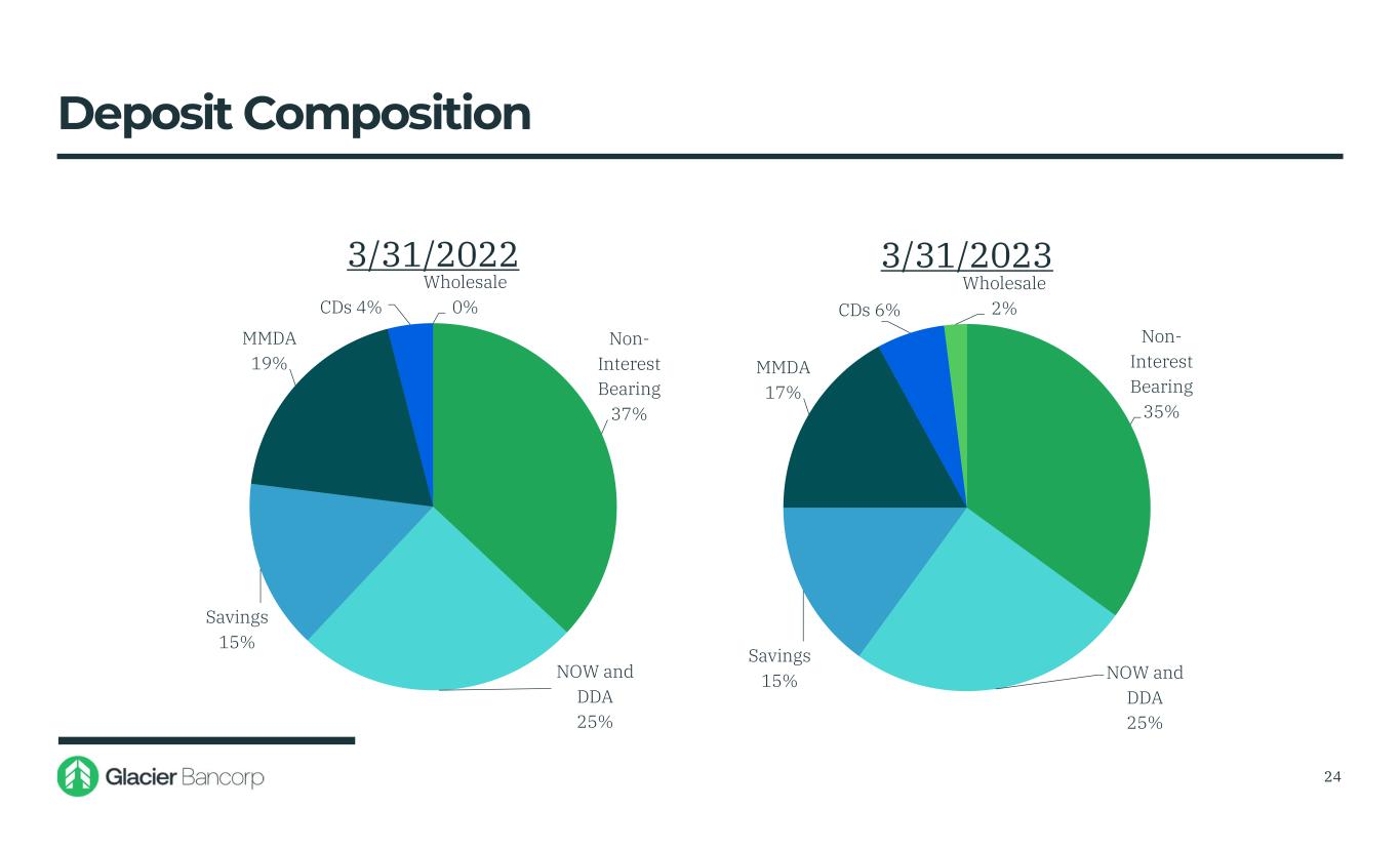 $9,494 $10,776 $14,798 $21,337 $20,607 $20,148 $6,000 $8,000 $10,000 $12,000 $14,000 $16,000 $18,000 $20,000 $22,000 $24,000 • During first quarter 2023, deposits decreased $459 million, or 2% • Banking industry saw record deposit outflows in 2022 • Uninsured deposits, excluding collateralized public deposits and cash held at the holding company, were $5.3 billion, or 26% of total deposits 23 Deposit Trends (Dollars in millions)