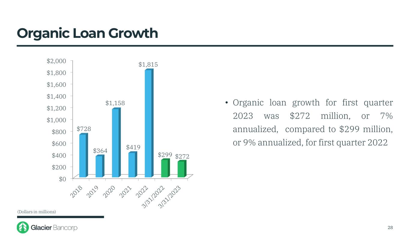 $8,288 $9,513 $11,123 $13,432 $15,247 $15,519 $7,000 $8,000 $9,000 $10,000 $11,000 $12,000 $13,000 $14,000 $15,000 $16,000 • Gross loans increased $272 million, or 7% annualized, during first quarter 2023 with the largest increase in commercial real estate of $195 million, or 8% annualized • Gross loans increased $1.8 billion, or 13%, from the prior year first quarter with the largest increase in commercial real estate of $1.1 billion, or 13 percent 27 Loan Trends (Dollars in millions)