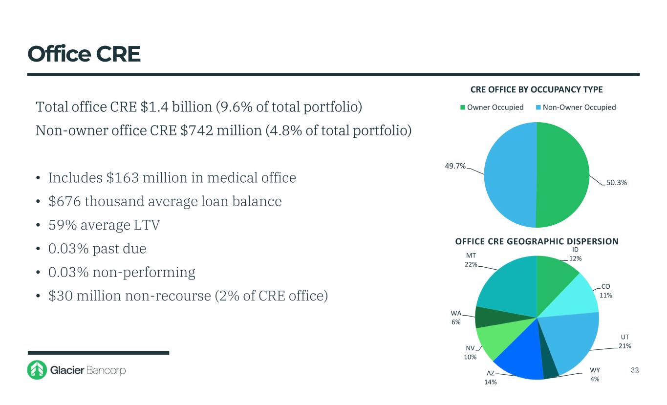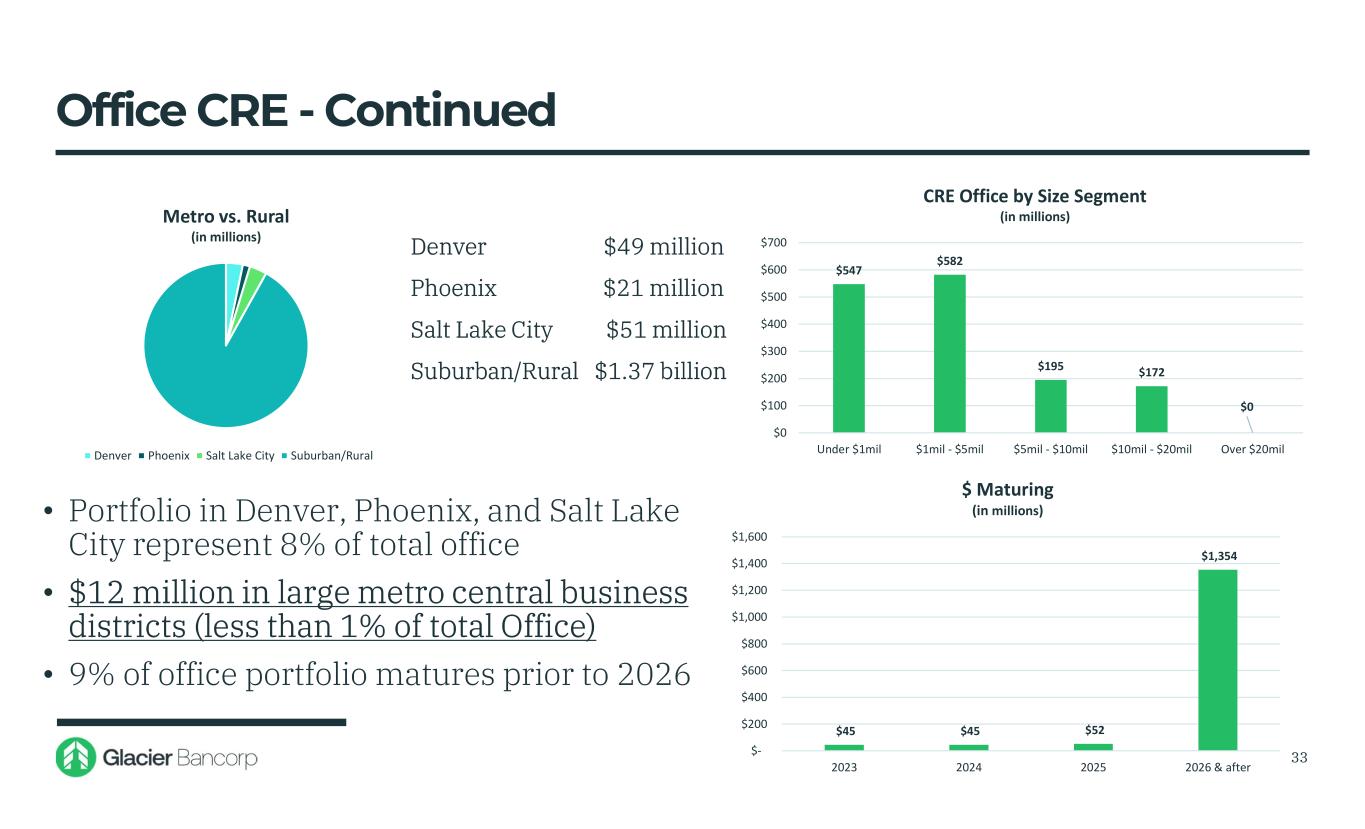 Office CRE Total office CRE $1.4 billion (9.6% of total portfolio) Non-owner office CRE $742 million (4.8% of total portfolio) • Includes $163 million in medical office • $676 thousand average loan balance • 59% average LTV • 0.03% past due • 0.03% non-performing • $30 million non-recourse (2% of CRE office) 50.3% 49.7% CRE OFFICE BY OCCUPANCY TYPE Owner Occupied Non-Owner Occupied ID 12% CO 11% UT 21% WY 4% AZ 14% NV 10% WA 6% MT 22% OFFICE CRE GEOGRAPHIC DISPERSION 32