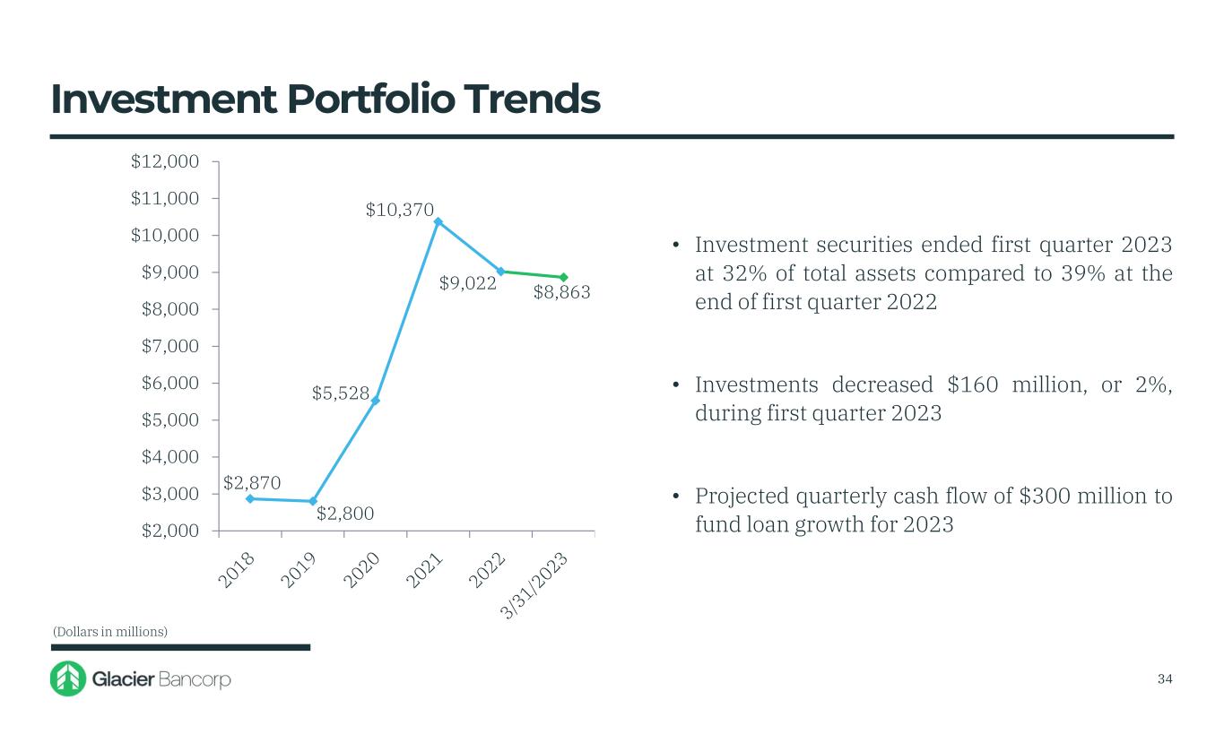 $2,870 $2,800 $5,528 $10,370 $9,022 $8,863 $2,000 $3,000 $4,000 $5,000 $6,000 $7,000 $8,000 $9,000 $10,000 $11,000 $12,000 • Investment securities ended first quarter 2023 at 32% of total assets compared to 39% at the end of first quarter 2022 • Investments decreased $160 million, or 2%, during first quarter 2023 • Projected quarterly cash flow of $300 million to fund loan growth for 2023 34 Investment Portfolio Trends (Dollars in millions)