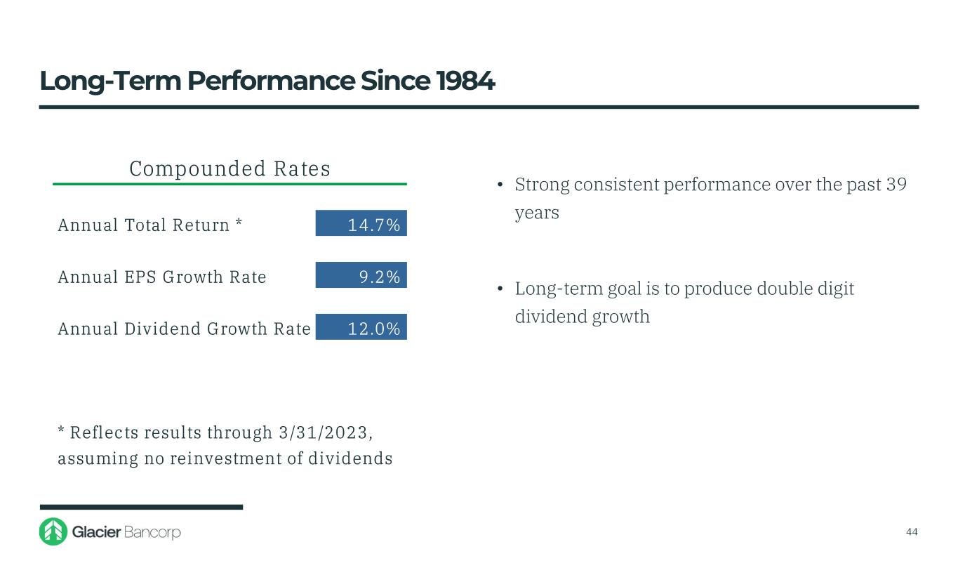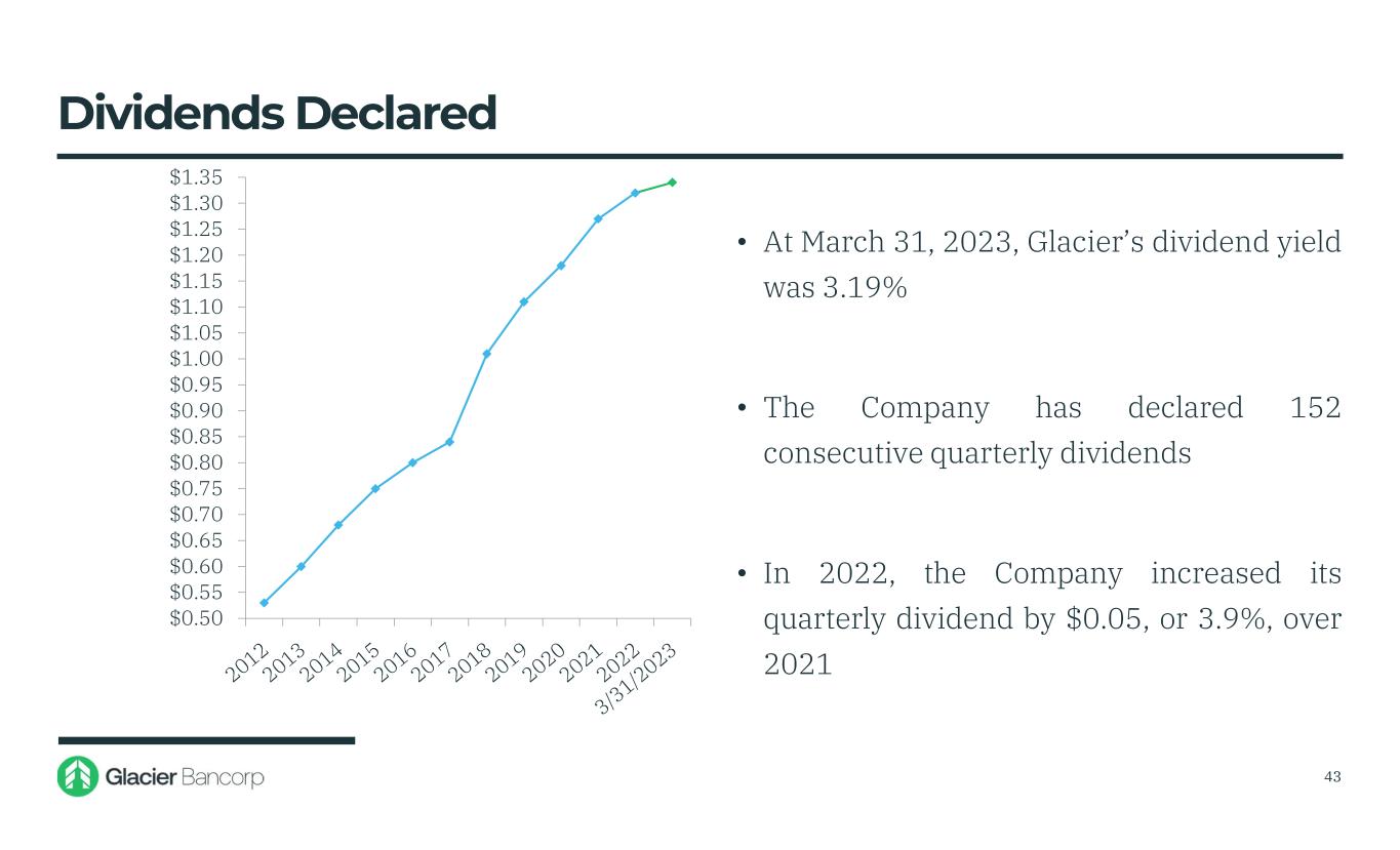 $0.50 $0.55 $0.60 $0.65 $0.70 $0.75 $0.80 $0.85 $0.90 $0.95 $1.00 $1.05 $1.10 $1.15 $1.20 $1.25 $1.30 $1.35 • At March 31, 2023, Glacier’s dividend yield was 3.19% • The Company has declared 152 consecutive quarterly dividends • In 2022, the Company increased its quarterly dividend by $0.05, or 3.9%, over 2021 43 Dividends Declared